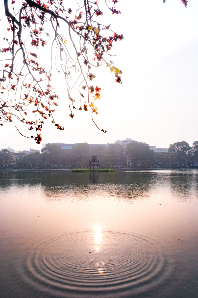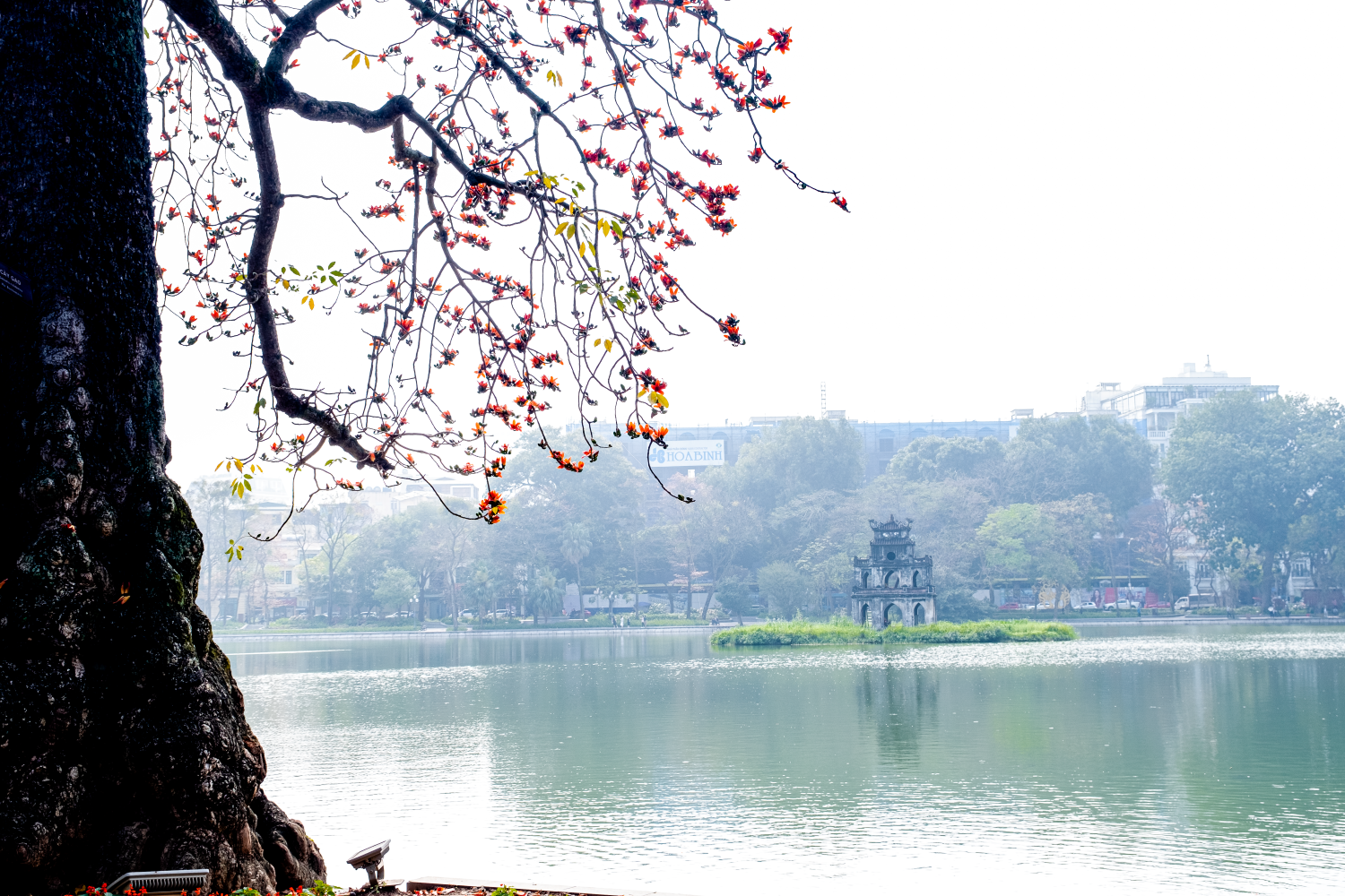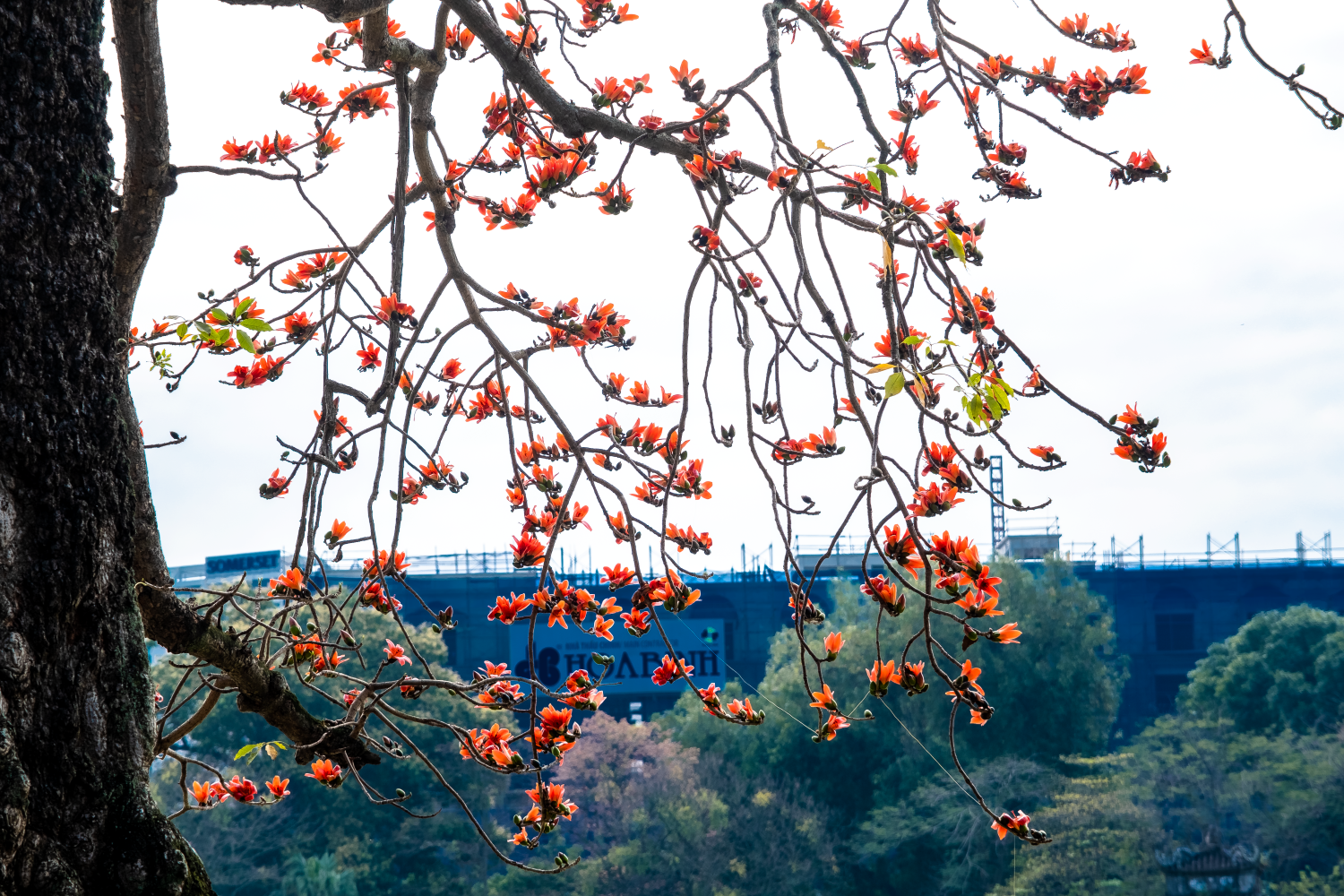 Cây gạo Bờ Hồ năm nay chụp góc nào cũng đẹp, chụp về phía phố Hàng Khay hay chụp xuôi nắng về phía cầu Thê Húc, ngay cả đứng từ phía phố Lê Thái Tổ chụp lấy Tháp Rùa và đặt cây gạo đỏ rực hoa làm hậu cảnh cũng có vẻ đẹp rất riêng. Nhưng đẹp nhất vẫn là đứng từ phía phố Đinh Tiên Hoàng chụp hất ra, vừa có không gian thoáng đãng, vừa lấy được cành hoa buông rủ và quan trọng là lấy trọn vẹn được Tháp Rùa. Hồ Gươm muốn chụp gì thì chụp, nếu không có Tháp Rùa vẫn không ra Hồ Gươm.