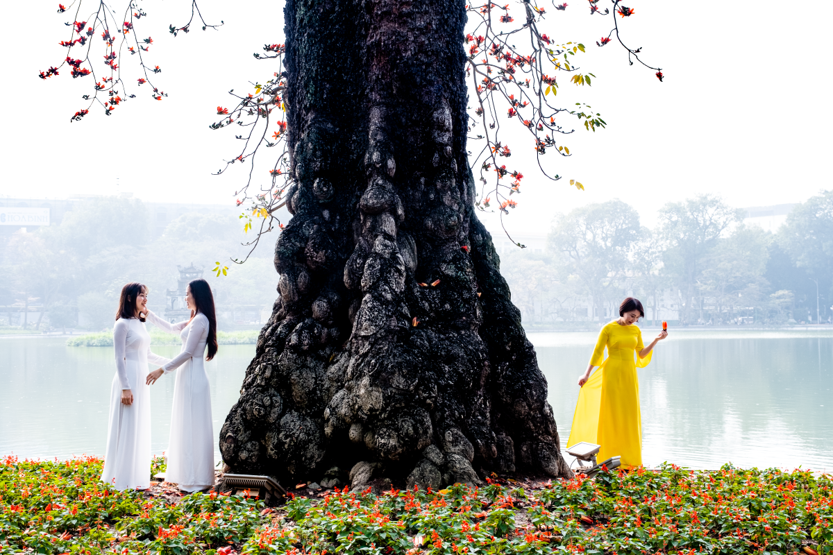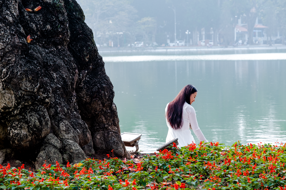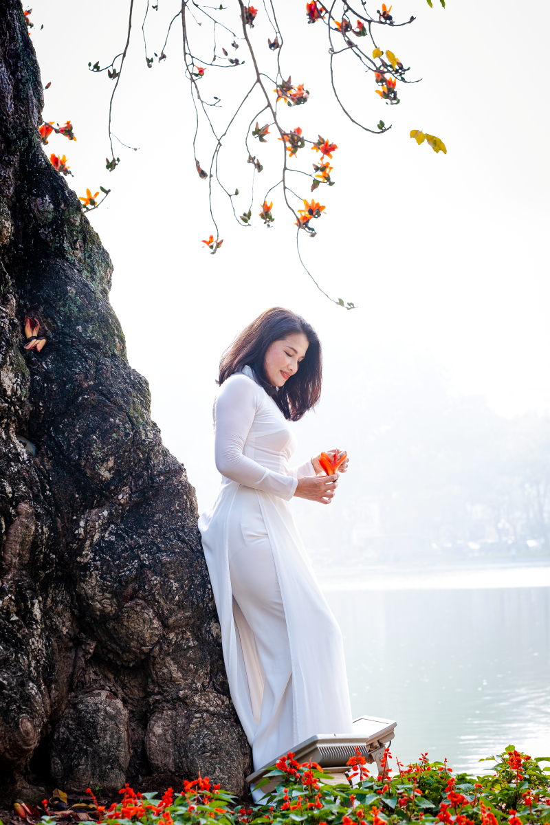 Nhưng đông nhất vẫn là các chị, các cô với đủ sắc màu và cũng không kể gì tuổi tác. Một tà áo dài trắng thướt tha nhẹ vờn gió xuân trong ánh nắng chiều dìu dịu phảng phất khói sương trên mặt hồ mờ ảo… Một bóng Tháp Rùa rêu phong trầm mặc soi bóng nước Hồ Gươm… Và cành hoa gạo đỏ chói buông dài như nhẹ nương theo gió rủ xuống mặt hồ… Tất cả hòa quyện vào nhau thành bức tranh thấm đẫm một hồn cốt Thăng Long – Hà Nội quả thực không bút nào tả nổi, mà chỉ có đắm mình trong khung cảnh ấy mới cảm nhận được hết hơi thở và khí thiêng nơi “lắng hồn núi sông ngàn năm…”...