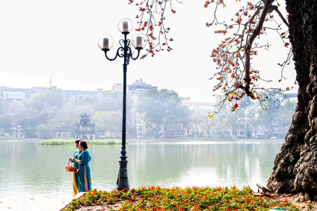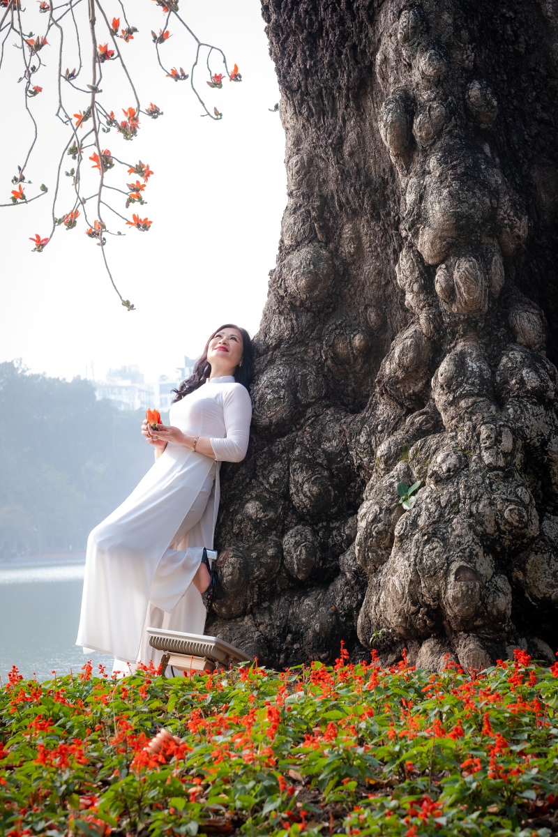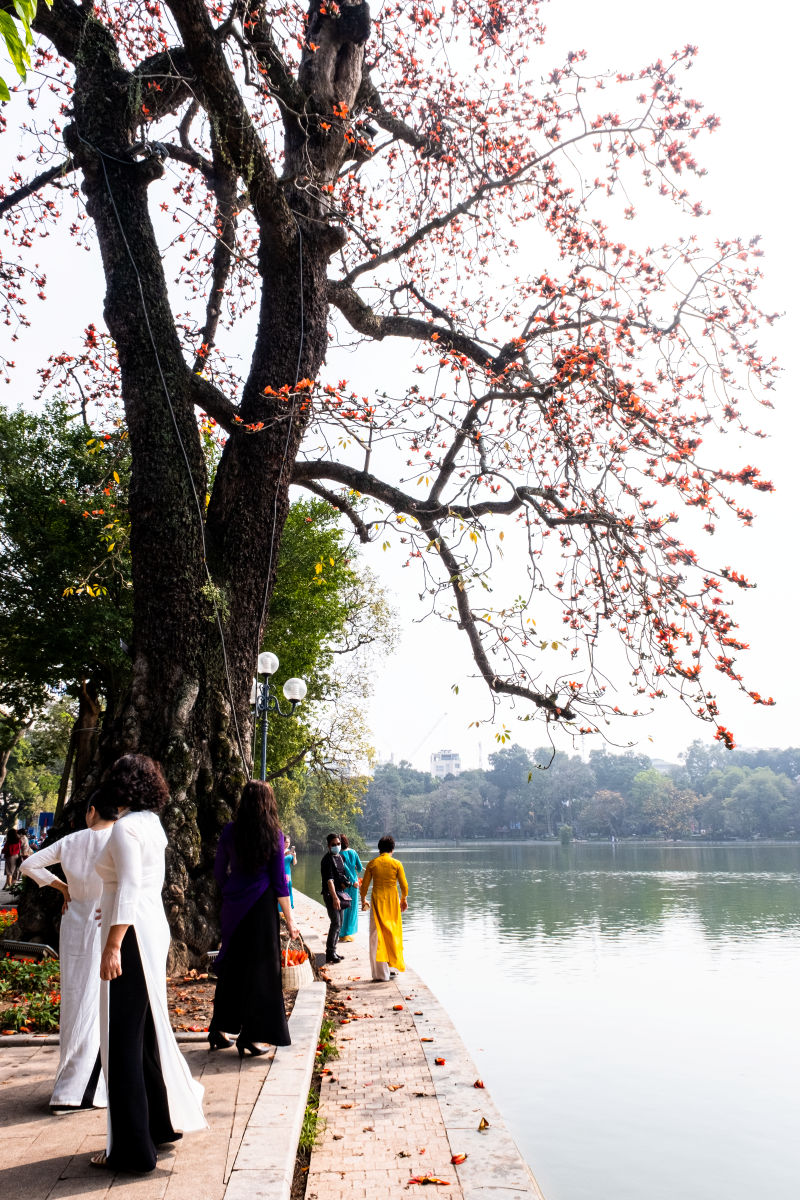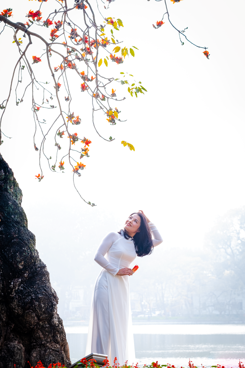 Nhưng đông nhất vẫn là các chị, các cô với đủ sắc màu và cũng không kể gì tuổi tác. Một tà áo dài trắng thướt tha nhẹ vờn gió xuân trong ánh nắng chiều dìu dịu phảng phất khói sương trên mặt hồ mờ ảo… Một bóng Tháp Rùa rêu phong trầm mặc soi bóng nước Hồ Gươm… Và cành hoa gạo đỏ chói buông dài như nhẹ nương theo gió rủ xuống mặt hồ… Tất cả hòa quyện vào nhau thành bức tranh thấm đẫm một hồn cốt Thăng Long – Hà Nội quả thực không bút nào tả nổi, mà chỉ có đắm mình trong khung cảnh ấy mới cảm nhận được hết hơi thở và khí thiêng nơi “lắng hồn núi sông ngàn năm…”...
