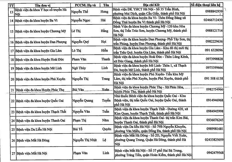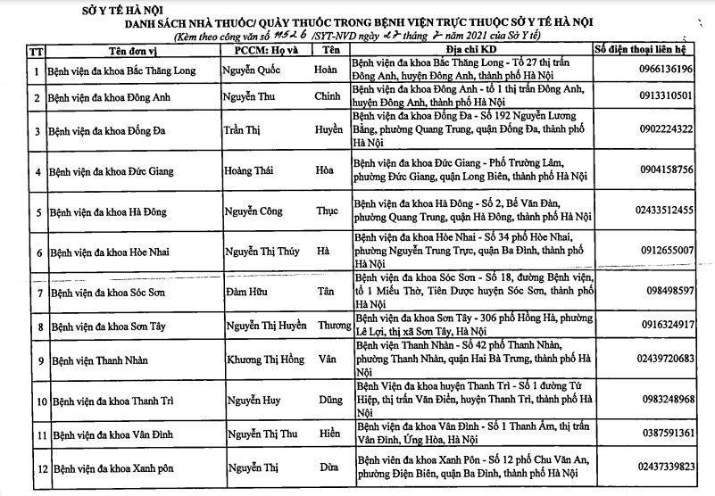 Thực hiện Chỉ thị số 17/CT-UBND ngày 23/7/2021 của UBND TP Hà Nội thực hiện giãn cách trên địa bàn thành phố để phòng chống dịch Covid-19, Sở Y tế thông báo danh sách nhà thuốc, quầy thuốc trong bệnh viện trực thuộc Sở Y tế; các nhà thuốc, quầy thuốc tư nhân bán lẻ thuốc phục vụ nhân dân trong những ngày thực hiện giãn cách xã hội.