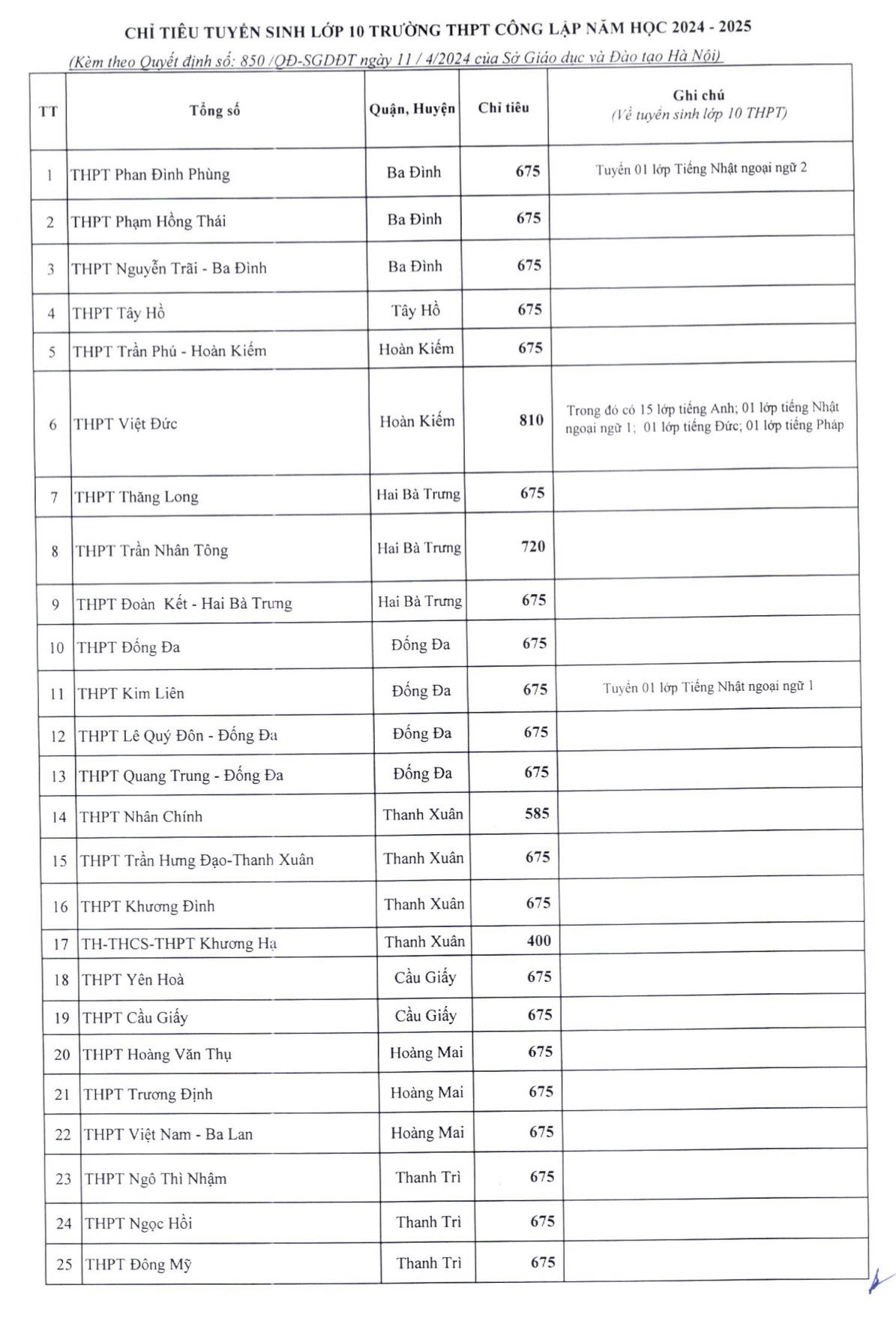 Sở Giáo dục và Đào tạo Hà Nội giao chỉ tiêu kế hoạch tuyển sinh lớp 10 năm học 2024 - 2025 cho 127 trường THPT công lập và công lập tự chủ tuyển mới 1.742 lớp và 77.250 học sinh.
