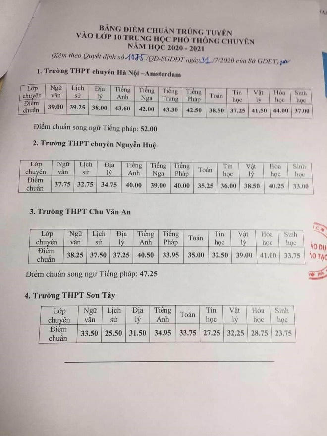Theo đó, Sở công bố điểm chuẩn trúng tuyển vào lớp 10 THPT chuyên năm học 2020 - 2021 của 4 trường gồm: Trường chuyên Hà Nội Amsterdam; trường chuyên Nguyễn Huệ, trường THPT Chu Văn An và trường THPT Sơn Tây.