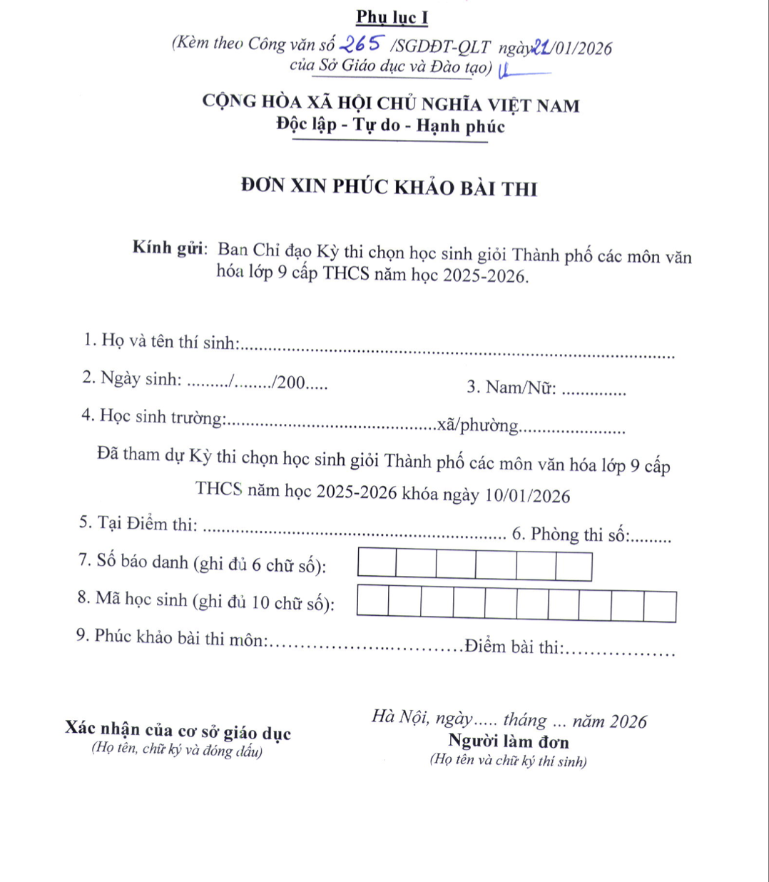 Sáng 22/01, Sở Giáo dục và Đào tạo Hà Nội thông báo kết quả điểm bài thi và hướng dẫn đăng ký phúc khảo bài thi Kỳ thi chọn học sinh giỏi Thành phố các môn văn hóa lớp 9 năm học 2025-2026.