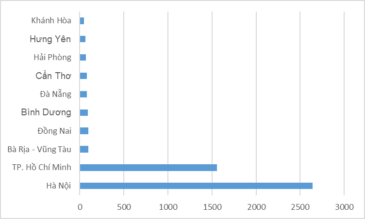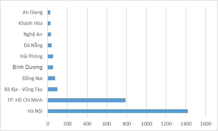 Hai địa phương sở hữu số lượng Bằng độc quyền sáng chế/giải pháp hữu ích nhiều nhất cả nước là Hà Nội và TP.HCM, lần lượt là 1.108 và 469 văn bằng, chiếm khoảng 74% tổng số Bằng độc quyền sáng chế/giải pháp hữu ích của cả nước. Các địa phương xếp sau là Bà Rịa – Vũng Tàu, Hải Phòng, Đà Nẵng, Bình Dương, Đồng Nai, Cần Thơ, Long An và Quảng Ninh.