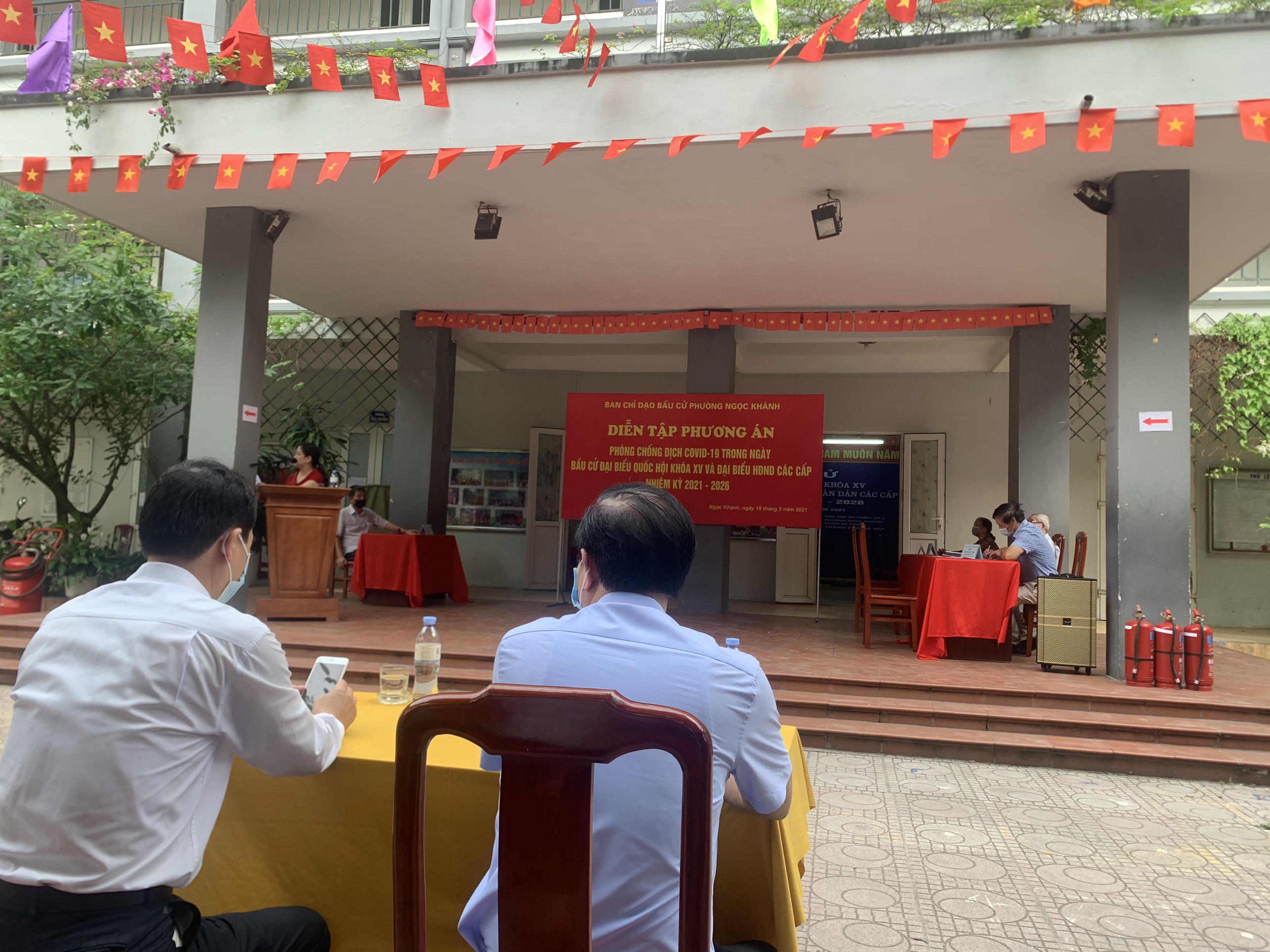 Tại buổi diễn tập, phường Ngọc Khánh đã đưa ra 5 tình huống giả định có thể xảy ra trong ngày bầu cử như: Thực hiện bỏ phiếu trong điều kiện kiểm soát phòng chống dịch;Xử lý đối với các trường hợp cử tri đến khu vực bỏ phiếu khi cử tri có biểu hiện thân nhiệt cao trên 37,5 độ và các cử tri diện F3, F4; Thực hiện bỏ phiếu lưu động tại khu phố, hoặc một số số nhà khi cử tri phải thực hiện cách ly y trú tại nơi cư trú;Bỏ phiếu lưu động tại biển số nhà;Bầu cử trong tình huống Tổ bầu cử có thành viên phải cách ly y tế;...