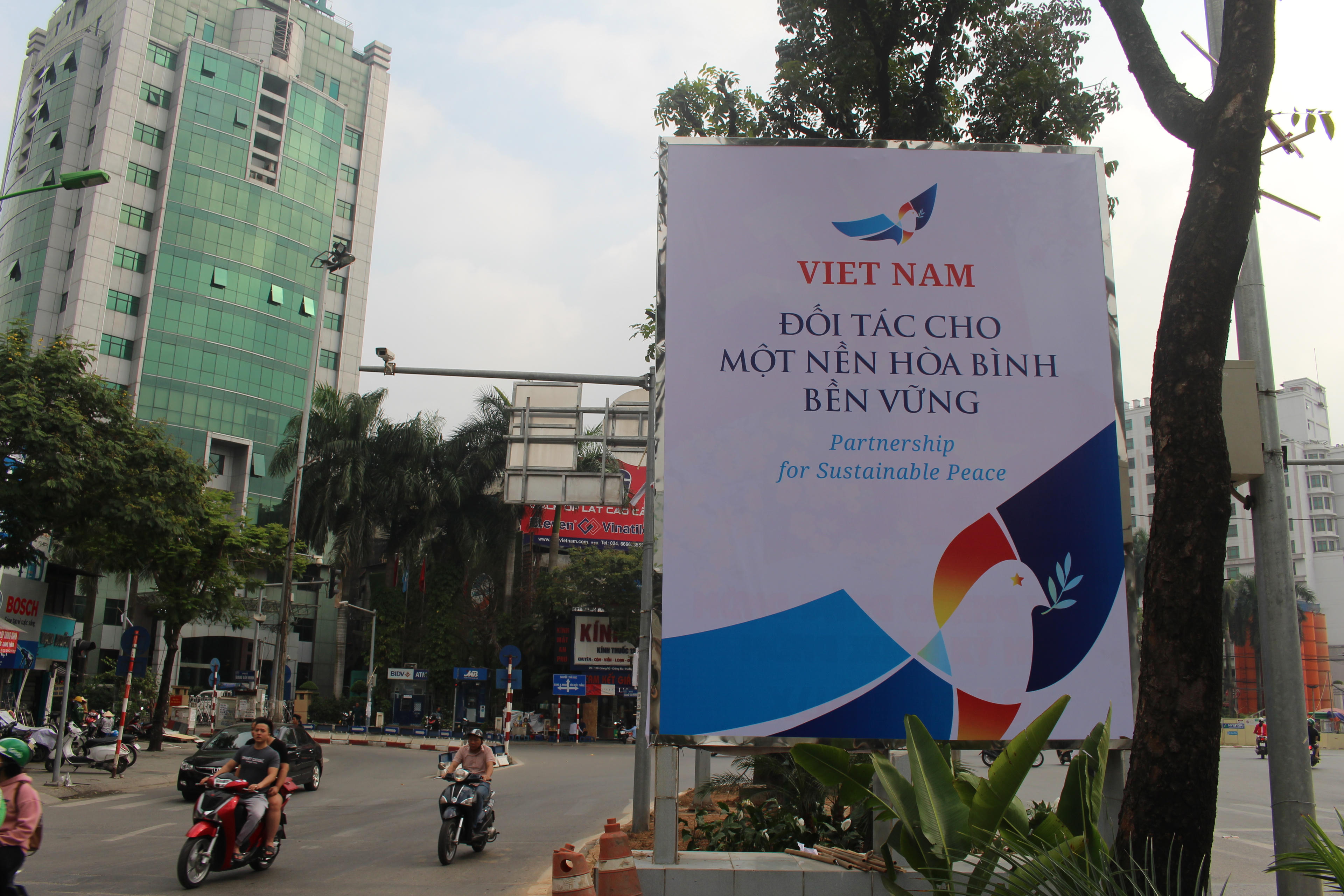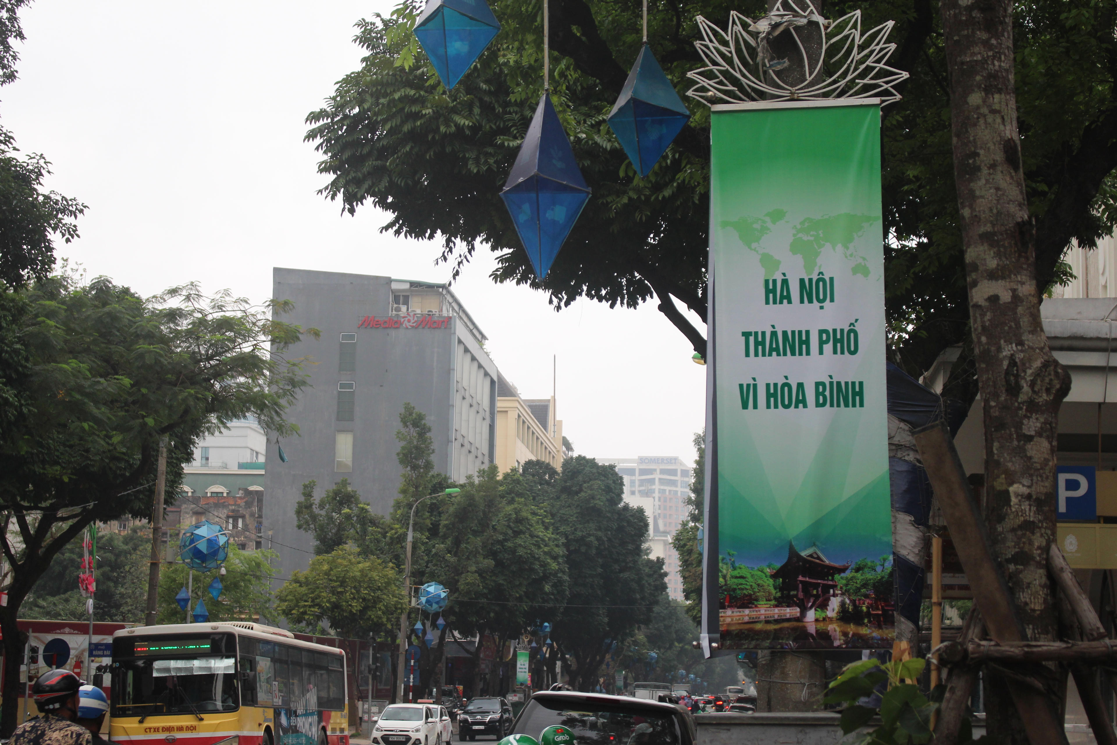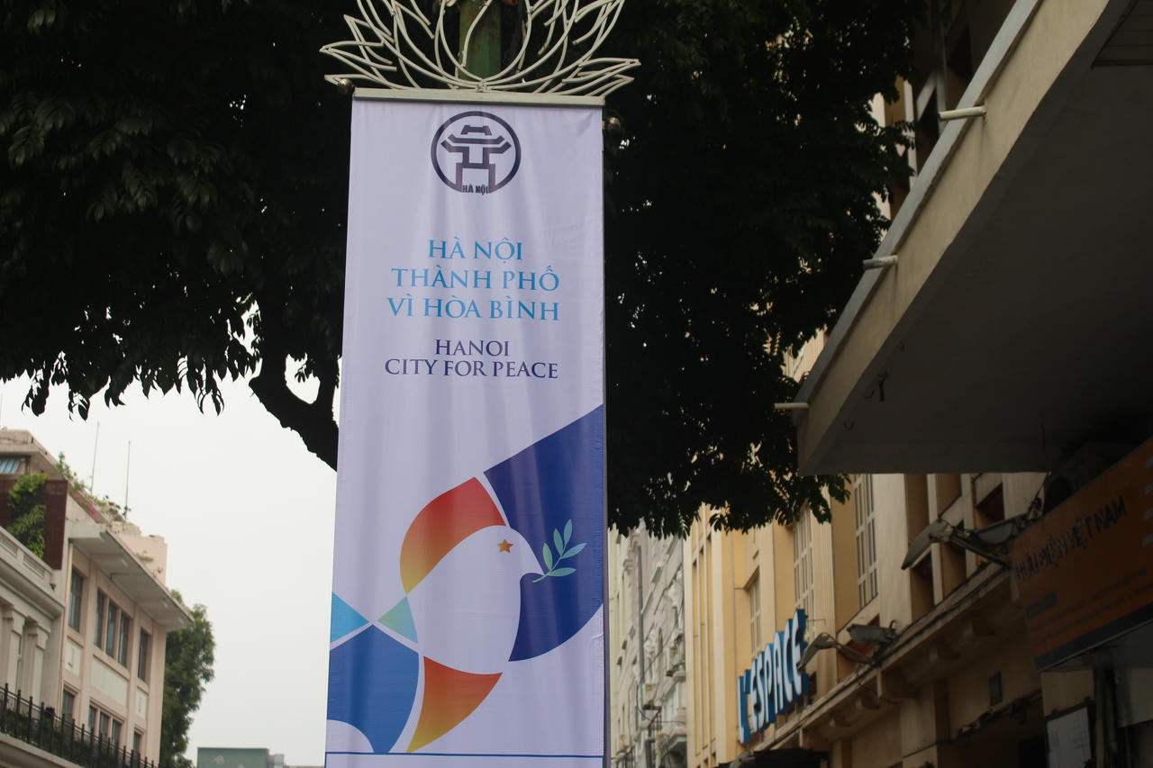 Băng rôn được treo trên nhiều tuyến phố với các thông điệp “Hà Nội, thành phố vì hòa bình” ; “Việt Nam, điểm đến thân thiện an toàn”