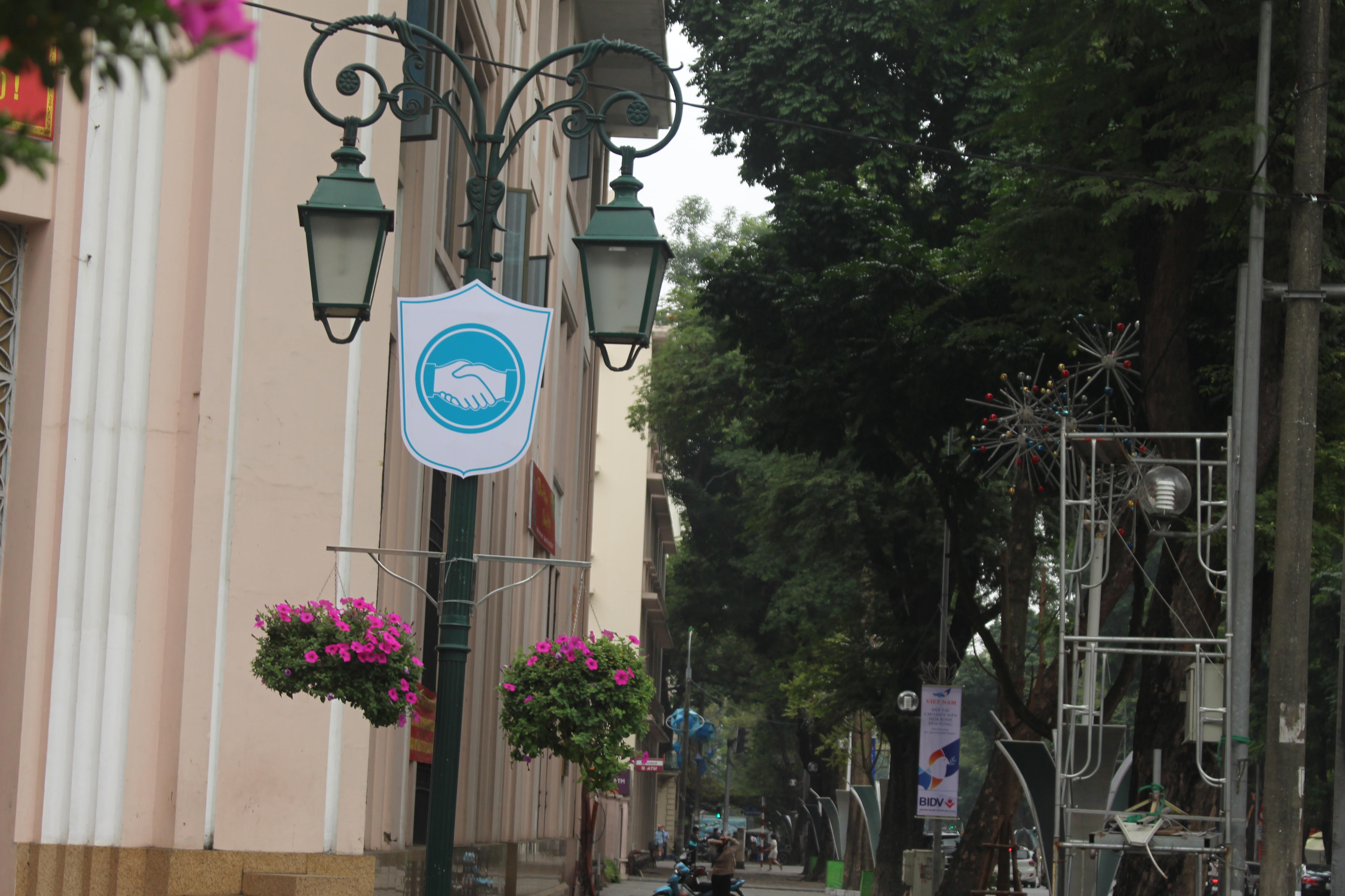 Các tuyến phố quanh khu vực hồ Gươm được treo những tấm biển với biểu tượng cái bắt tay, thể hiện thông điệp hòa bình mà mọi người mong muốn sau cuộc gặp