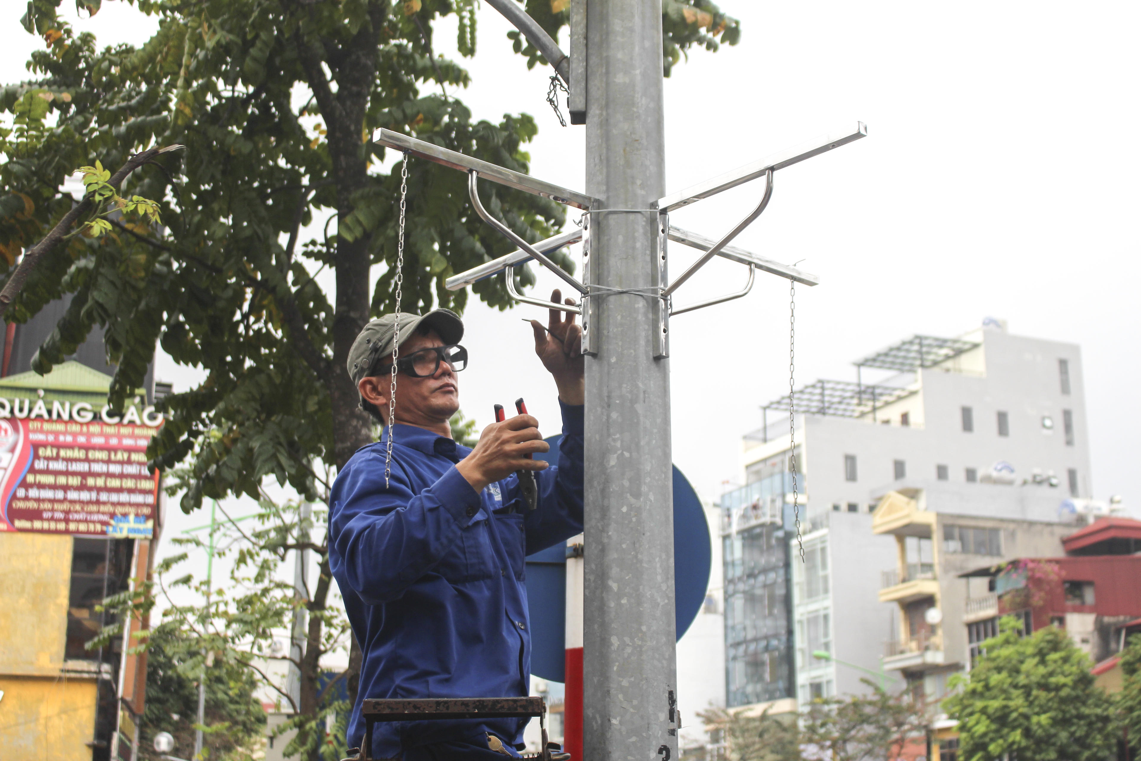 Công nhân của “Công ty Công viên cây xanh Hà Nội” đang gấp rút sửa lại các giá đỡ để treo các giỏ hoa tươi trên tuyến phố Kim Mã