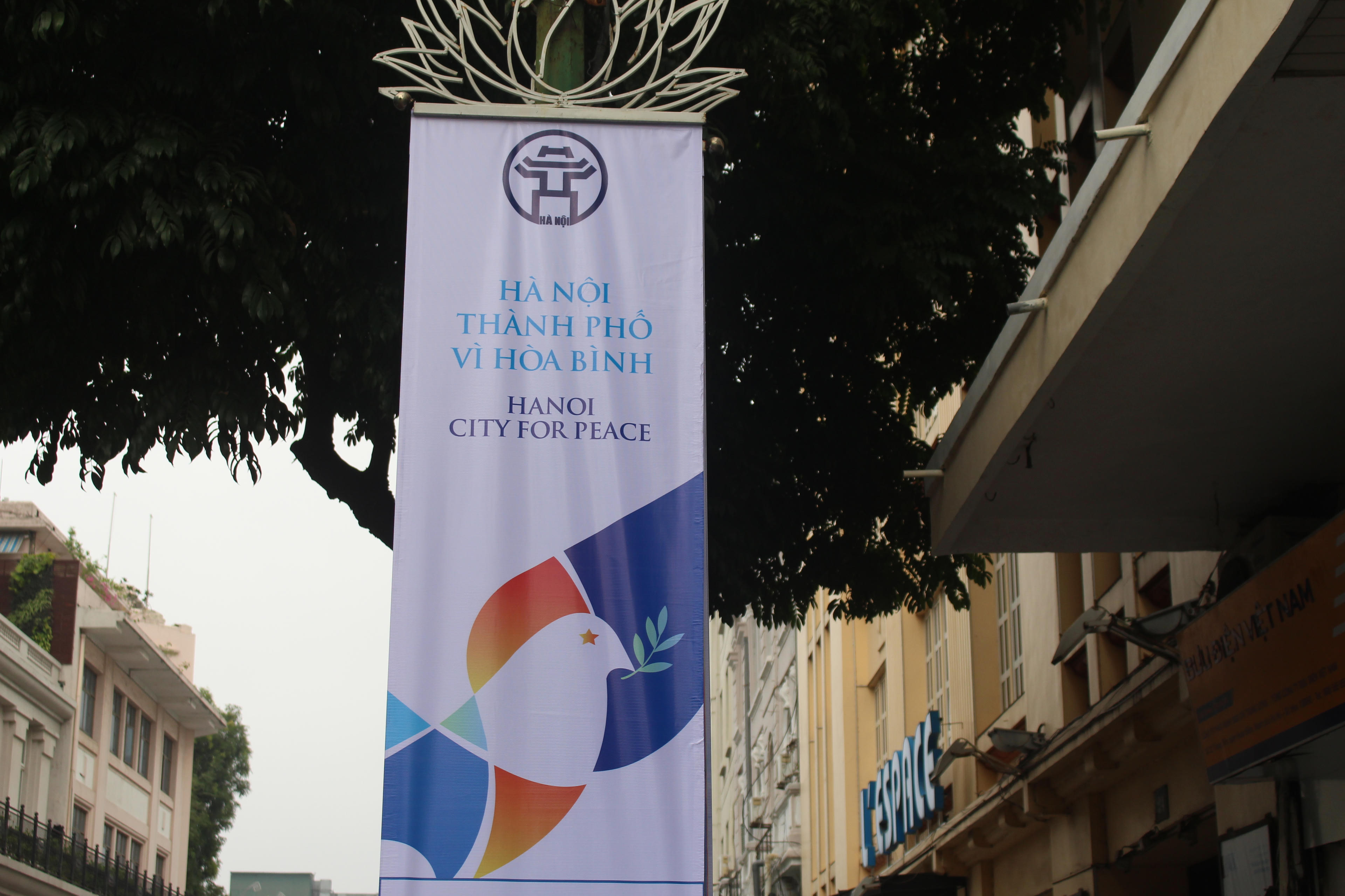 Tấm băng rôn với hình ảnh cánh chim hòa bình được treo trên nhiều tuyến phố: Ngô Quyền, Tràng Tiền, Đinh Tiên Hoàng…