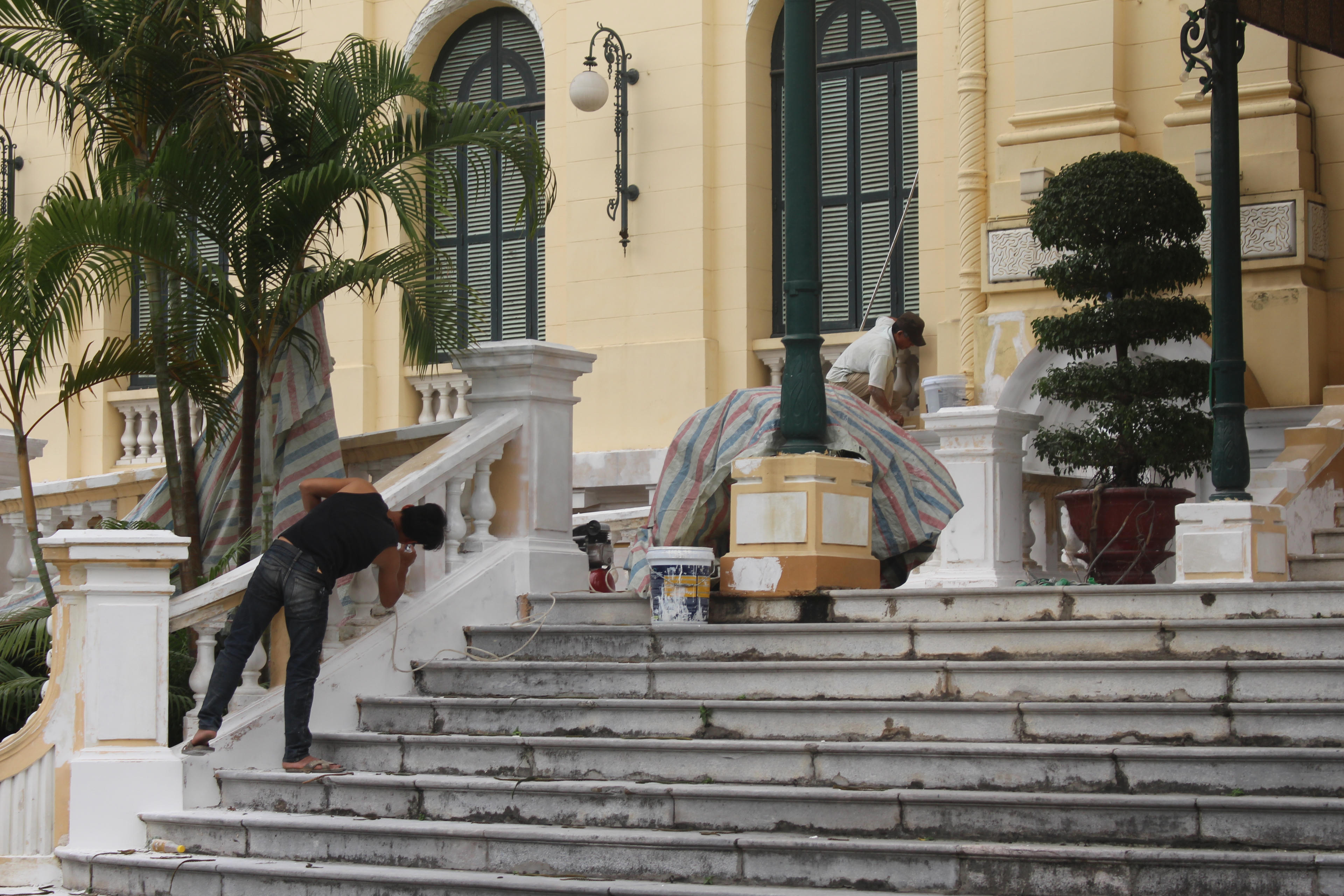 Nhà khách Chính phủ đang được các công nhân tất bất sơn sửa để tiếp đón các vị khách quý