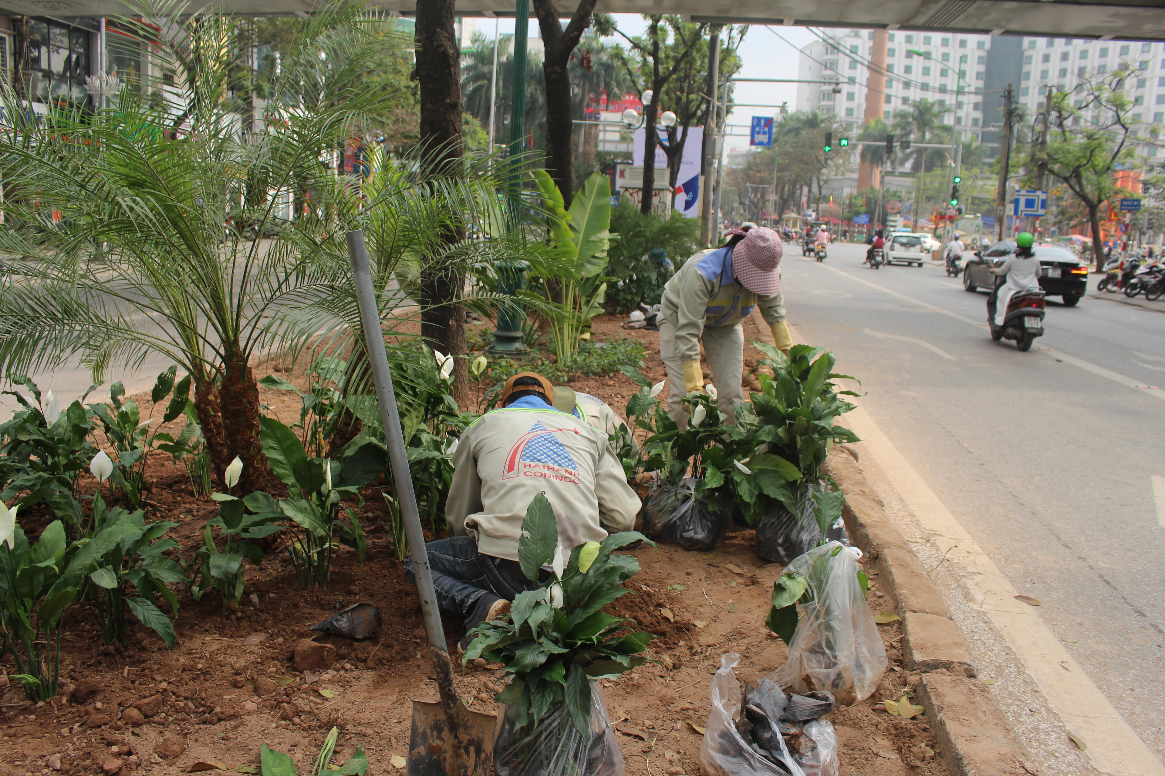 Công nhân đang khẩn trương trồng lại hoa trên đường Giảng Võ, hoạt động này được triển khai từ ngày 15/2, hiện các công nhân phải thay ca làm thâu đêm để chỉnh trang đường phố kịp tiến độ