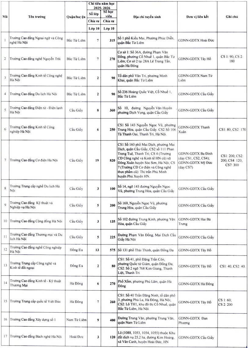 Trong số 46 cơ sở giáo dục nghề nghiệp được giao chỉ tiêu, một số trường có chỉ tiêu cao như: Trường Cao đẳng Cơ điện Hà Nội (820), Cao đẳng Nghề kỹ thuật công nghệ (675), Cao đẳng nghề Việt Nam - Hàn Quốc thành phố Hà Nội (595), Cao đẳng Cộng đồng Hà Tây (585), Cao đẳng Nghề công nghiệp Hà Nội (575), Cao đẳng Công nghệ cao Hà Nội (570), Cao đẳng Quốc tế Hà Nội (490 chỉ tiêu), Cao đẳng Giao thông vận tải Trung ương 1 (450),...