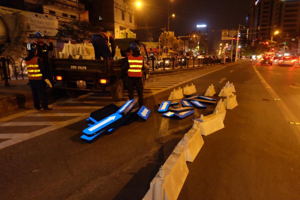 Khoảng 22h ngày 20/1, hàng chục công nhân được huy động để lắp dải phân cách phục vụ tuyến xe buýt nhanh BRT trên đường Giảng Võ hướng lưu thông từ Kim Mã đi Yên Nghĩa.