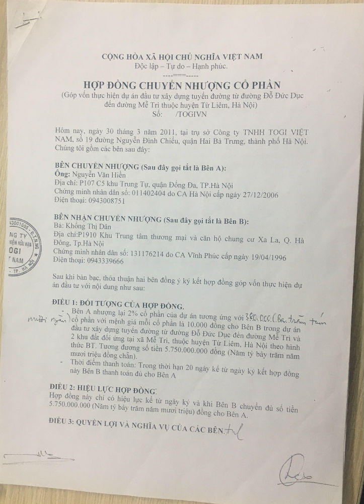 Do đang có mong muốn đầu tư vào đất đai và tin tưởng vào lời giới thiệu trên, ngày 30/3/2011, dưới sự chứng kiến của ông Tiến, bà Dân đã ký hợp đồng với ông Hiền để nhận chuyển nhượng 380.000 cổ phần của Cty TNHH TOGI Việt Nam (giá 10.000 đồng cổ phần), tổng giá trị 5,75 tỷ đồng. Vào các ngày 31/3/2011 và 10/5/2011, bà Dân đã lần lượt thanh toán cho ông Hiền toàn bộ số tiền trên.