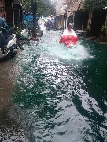 (PLO) - Sau trận mưa đêm qua (21/9), nhiều người dân khu vực ngõ 87 Tam Trinh, phường Mai Động, quận Hoàng Mai rất hoang mang và lo lắng khi nước ngập sâu tới đầu gối và màu nước chuyển thành màu xanh kỳ lạ.