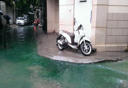 Anh Phạm Thái Bảo, người dân ở ngõ 87 cho biết, sau trận mưa từ đêm, sáng sớm nay, nước trong ngõ ngập sâu đến đầu gối, khiến các phương tiện đi lại khó khăn. Lúc đó, nước ngập trong ngõ vẫn có màu bình thường nhưng đến khoảng 6h30, dòng nước này bỗng chuyển màu xanh kỳ lạ.
