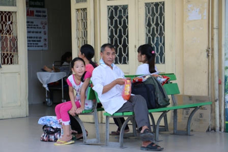 Nhiều người bệnh đến từ các tỉnh như Hà Nam, Nam Định, Thái Bình... đang tụ tập dưới những bóng cây chờ đợi đến lượt khám. "Tôi đợi ở đây từ 7h sáng, đến giờ này là 10h rồi mà vẫn chưa vào khám được, thời tiết oi bức quá nên ra đây ngồi cho mát", bà Nguyễn Thị Hoa, quê Thái Bình chia sẻ.