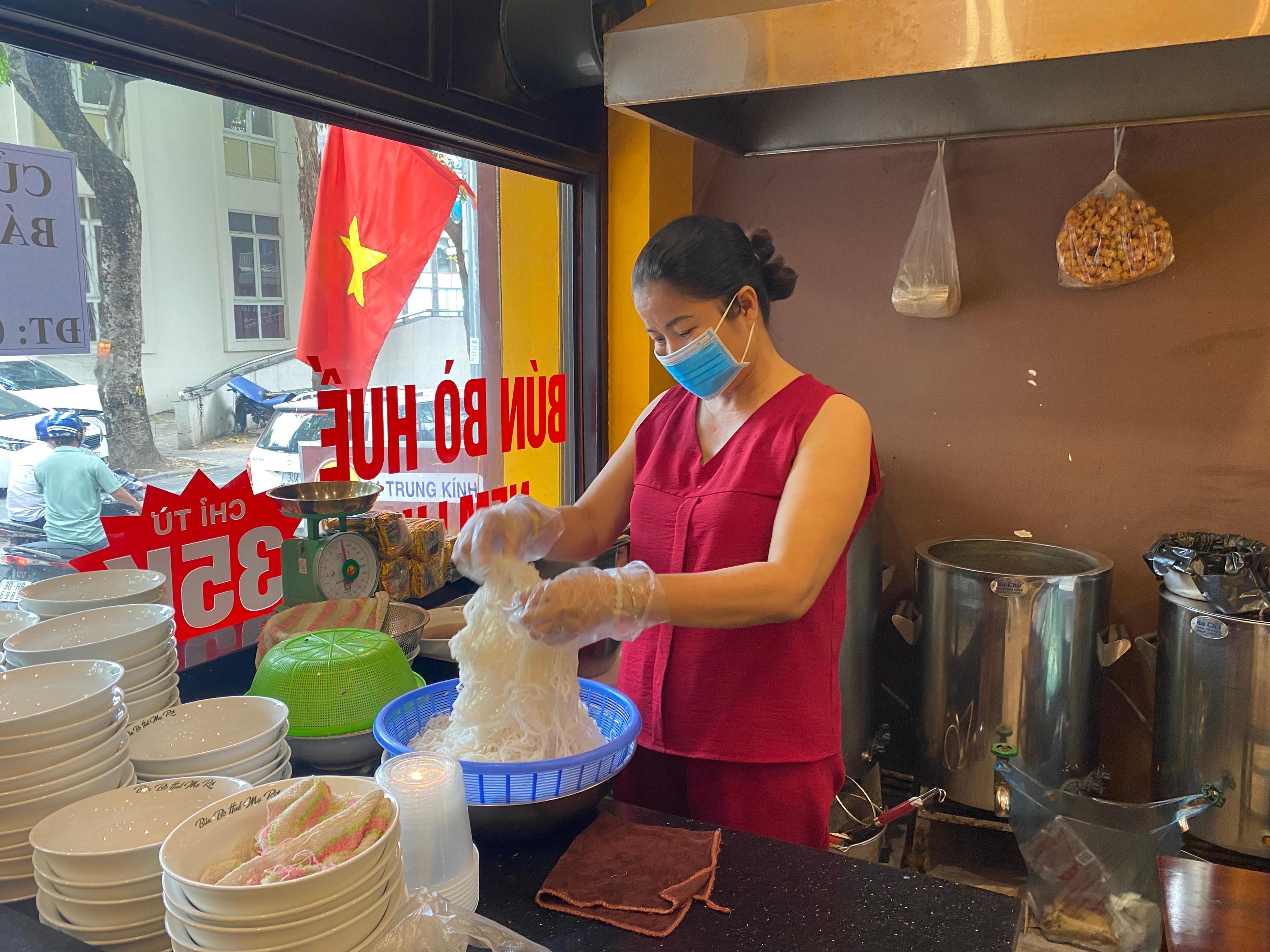 Tại quán Bún Bò Huế, số 21 Trung Kính, ngay từ sáng sớm, cô Hiền cùng nhân viên quán đã tất bật mở cửa chuẩn bị đón khách.