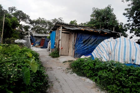 Những ngôi nhà tạm bợ được xây dựng trên những phần đất trống trong khu nghĩa trang để hoạt động nghề sơ chế lông vịt, lông gà.