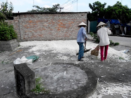 Môi trường tại các khu người dân đang làm việc, bị ô nhiễm nghiêm trọng. Mùi hôi bốc lên nồng nặc từ những đống lông vũ, bụi lông vũ bay mù mịt khắp cả một vùng…