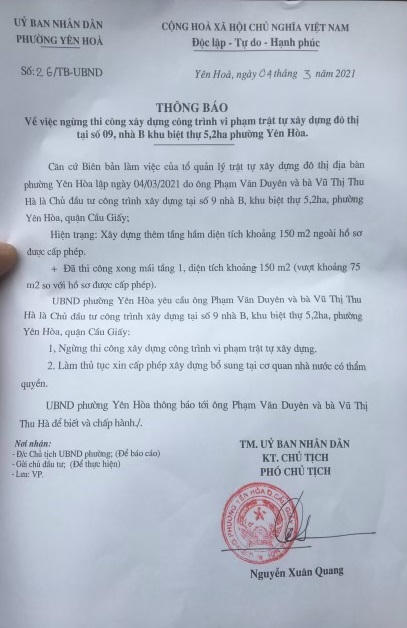 Trong số này, chủ đầu tư xây dựng công trình số 9, nhà B, khu biệt thự 5,2ha đã có vi phạm trong quá trình xây dựng như, xây dựng thêm tầng hầm diện tích khoảng 150m2 ngoài hồ sơ được cấp phép; thi công mái tầng 1 vượt quá 75 so với hồ sơ được cấp phép và để vật liệu xây dựng ngổn ngang gây ô nhiễm môi trường và cản trở người tham gia giao thông. Việc vi phạm trật tự xây dựng này đã bị chính quyền phường Yên Hòa lập biên bản, yêu cầu dừng thi công để xin phép theo quy định.