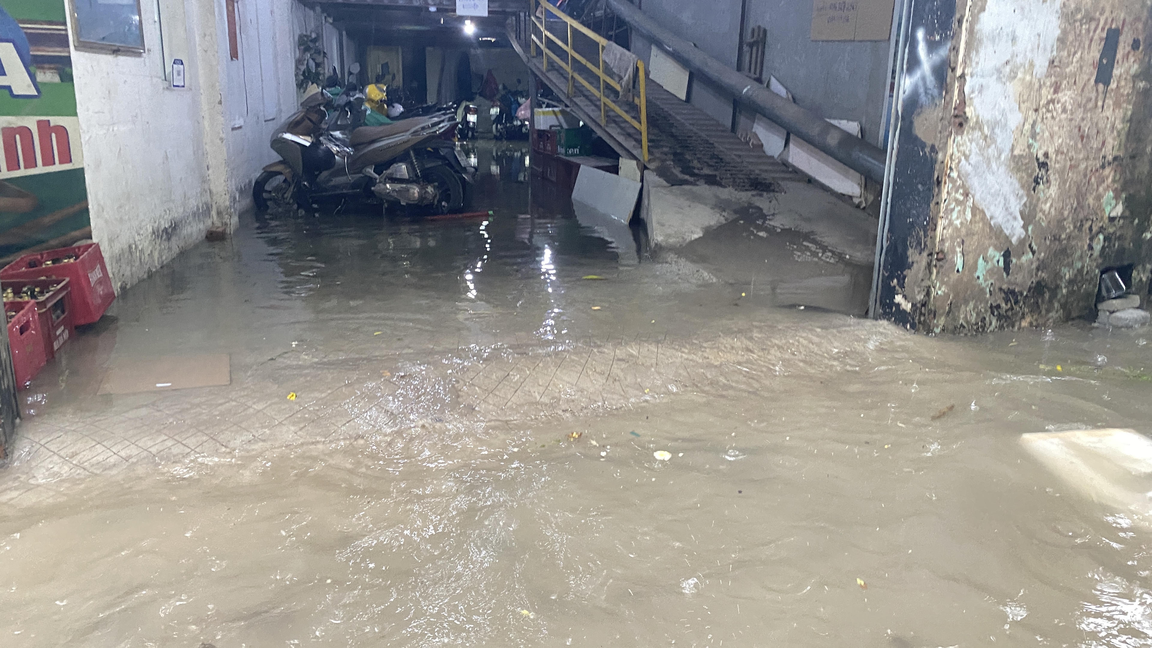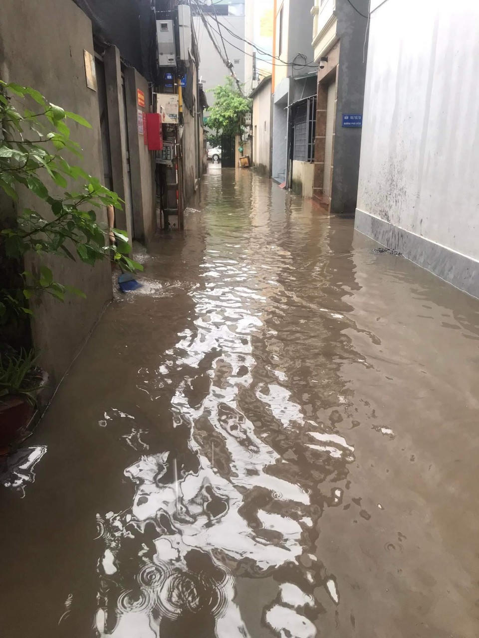 Ghi nhận tại Mỹ Đình, Cầu Giấy, Phạm Văn Đồng... cơn mưa từ lúc 9h sáng đã làm một số con ngõ ngập sâu trong nước.
