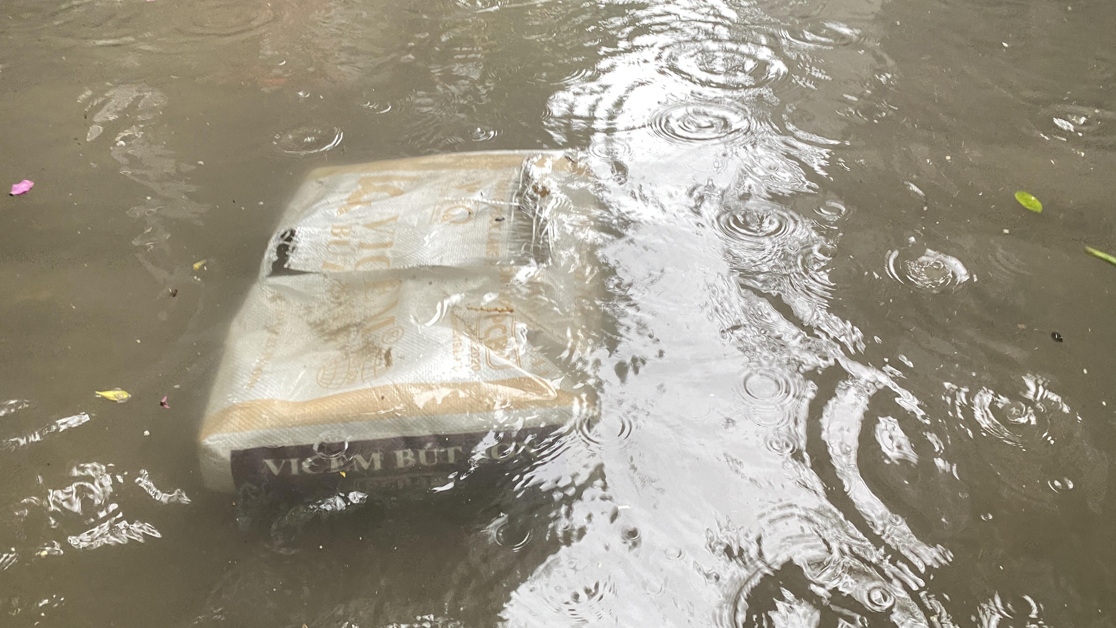 Mưa lớn, nước ngập khiến rác thải trôi lềnh phềnh. |