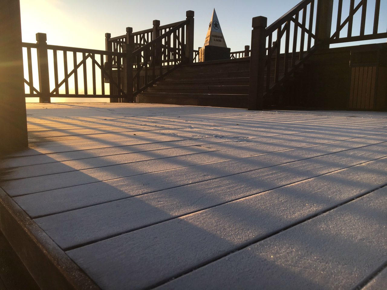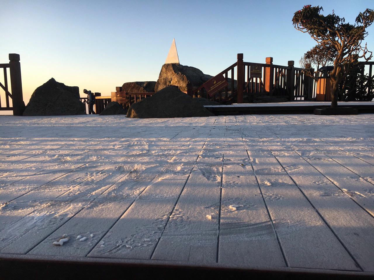 Lớp băng giá dày khoảng 5mm, phủ trên mặt sàn khu vực chóp tháp Fansipan một màu trắng tinh khôi. Theo đại diện của khu du lịch Sun World Fansipan Legend, vào lúc 5h30 sáng nay 12/3 nhiệt độ tại đỉnh Fansipan là 2 độ C kéo theo xuất hiện hiện tượng băng giá.
