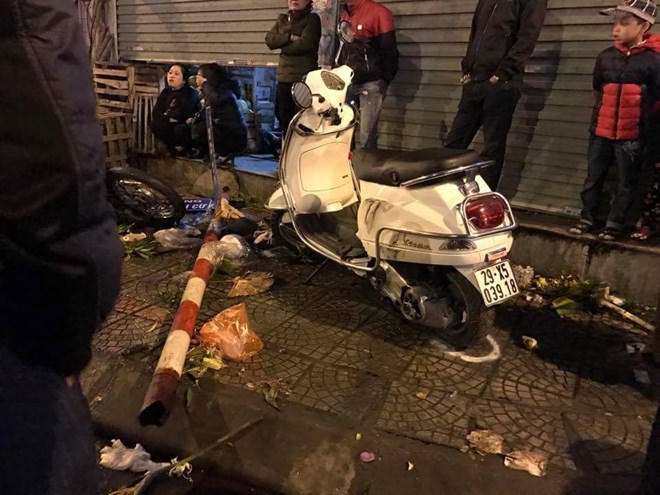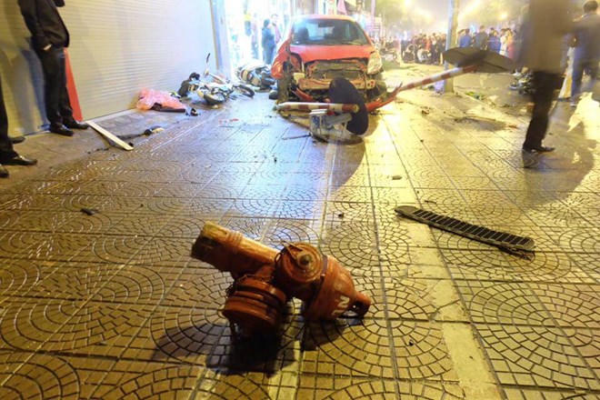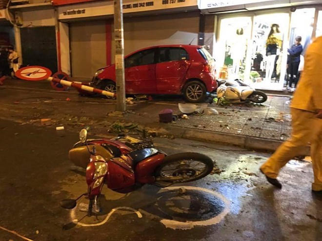 Vụ việc khiến nhiều xe máy hư hỏng nằm la liệt trên đường, chiếc xe ô tô cũng bị hư hỏng nặng phần đầu và lao lên vỉa hè.