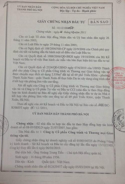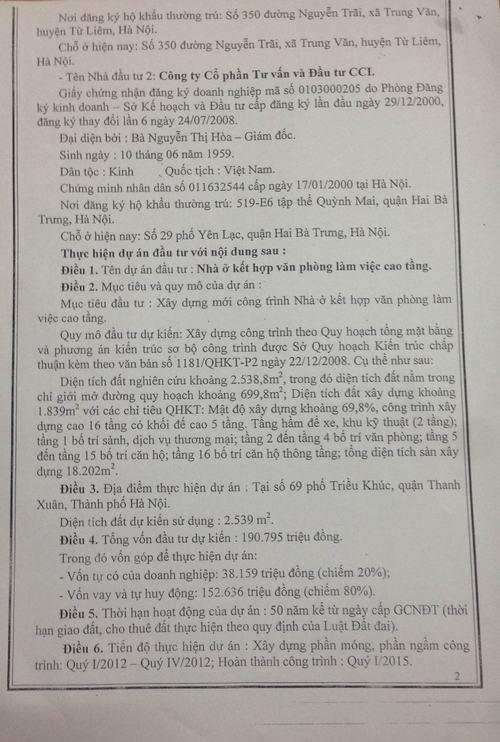 Theo tìm hiểu của phóng viên, chủ đầu tư là Công ty Traco trước khi mở bán căn hộ chung cư đã đem toàn bộ các quyền của bên thế chấp được hưởng từ Hợp đồng hợp tác đầu tư số 08-09/HĐLĐ ký giữa Công ty Cổ phần Tư vấn và Đầu tư CCI và Công ty Traco cho một Ngân hàng TMCP ở TP Hồ Chí Minh, có Chi nhánh Hoàn Kiếm. Công ty Traco cam kết không nhận hoa lợi, lợi tức, phần giá trị/tài sản tăng thêm mà dùng các khoản hoa lợi, lợi tức đó, phần giá trị/tài sản tăng thêm này để thanh toán nợ vay cho ngân hàng này.
