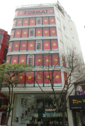 | Cửa hàng thời trang FORMAT thể hiện tình yêu quê hương bằng cách treo cờ vào tất cả các ô cửa sổ. - một ngôi nhà đồ sộ rợp bóng cờ đỏ, giữa con phố lớn khiến ai đi qua cũng phải ngắm nhìn. |