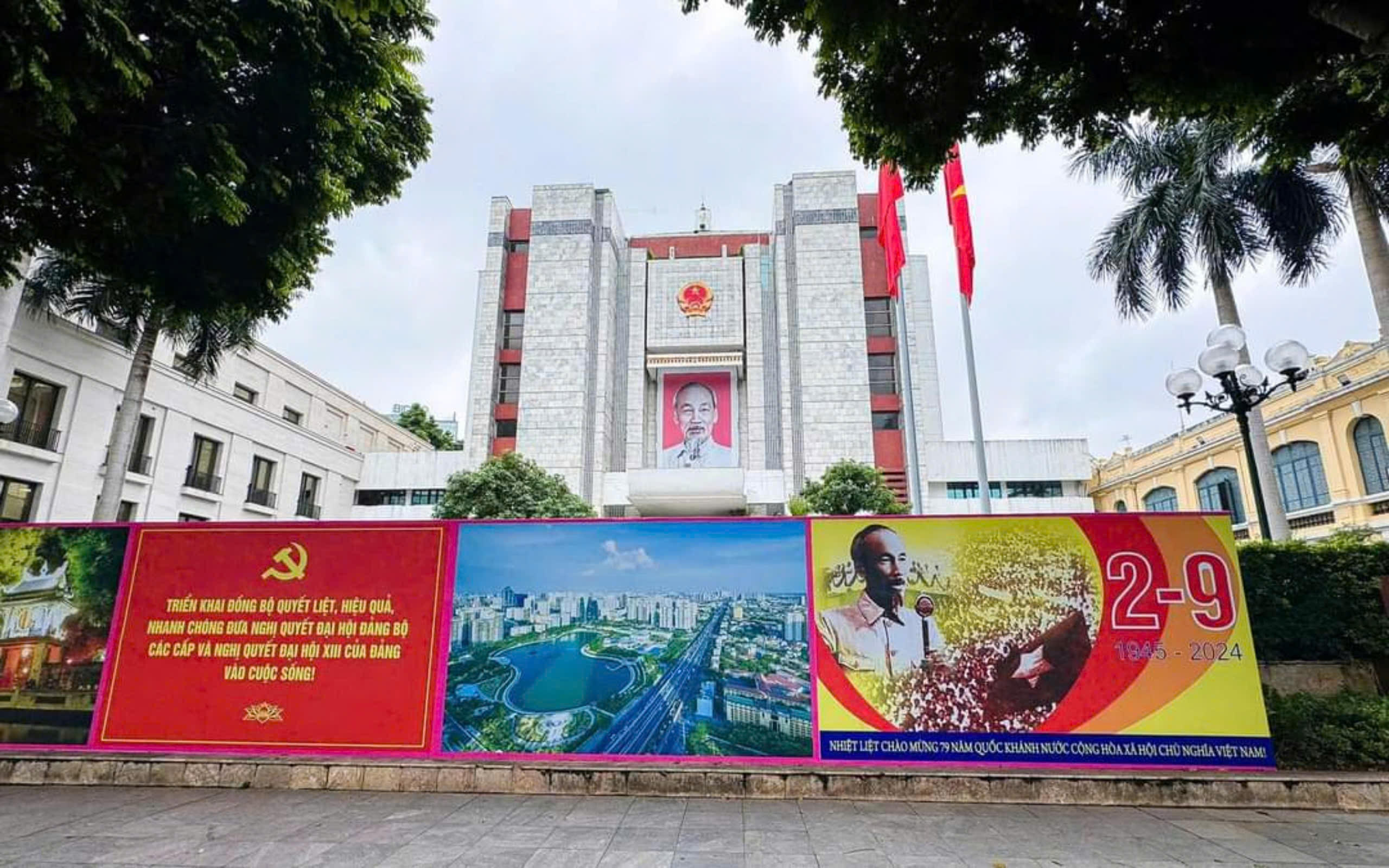 Pano khổ lớn chào mừng 79 năm Quốc khánh nước Cộng hòa xã hội chủ nghĩa Việt Nam tại trụ sở UBND TP Hà Nội.