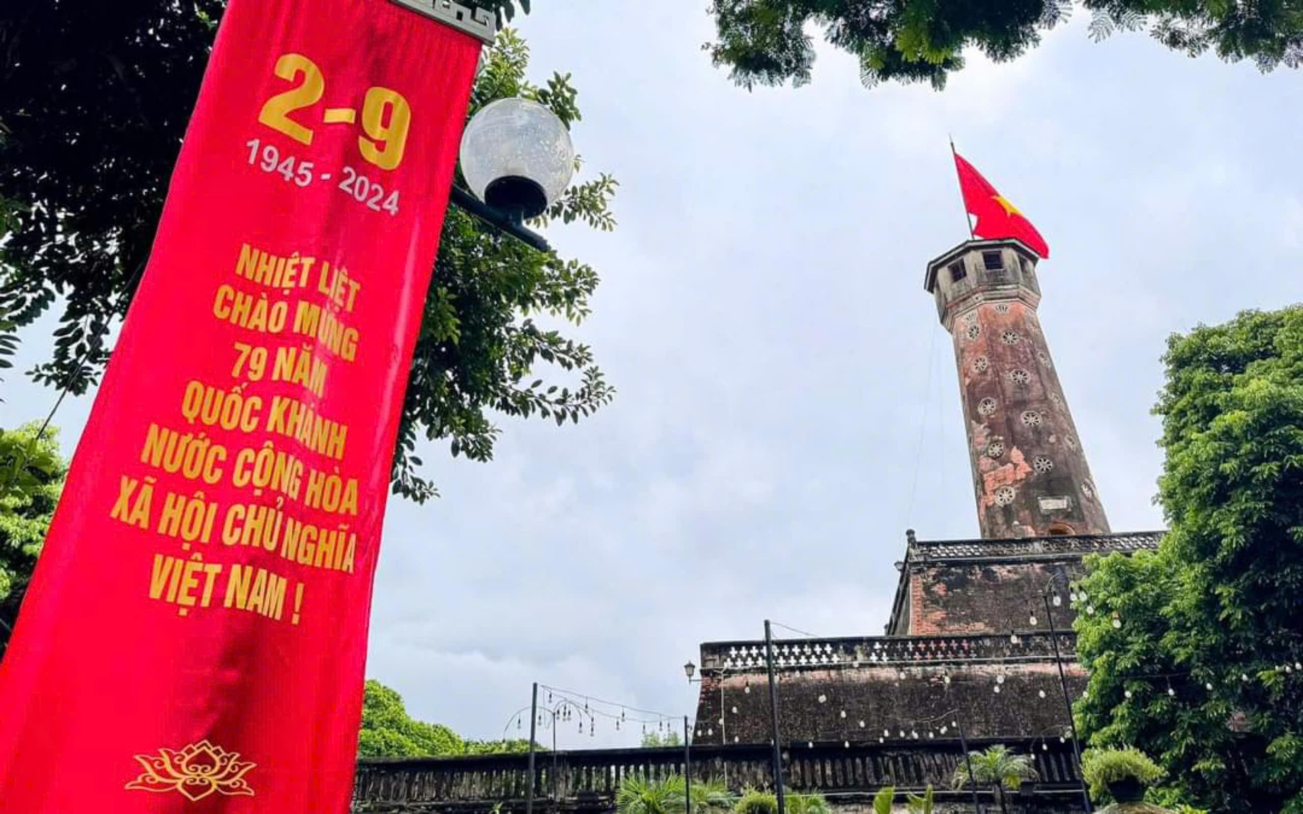 Băng rôn chào mừng 79 năm Quốc khánh nước Cộng hòa xã hội chủ nghĩa Việt Nam trước Cột cờ Hà Nội.