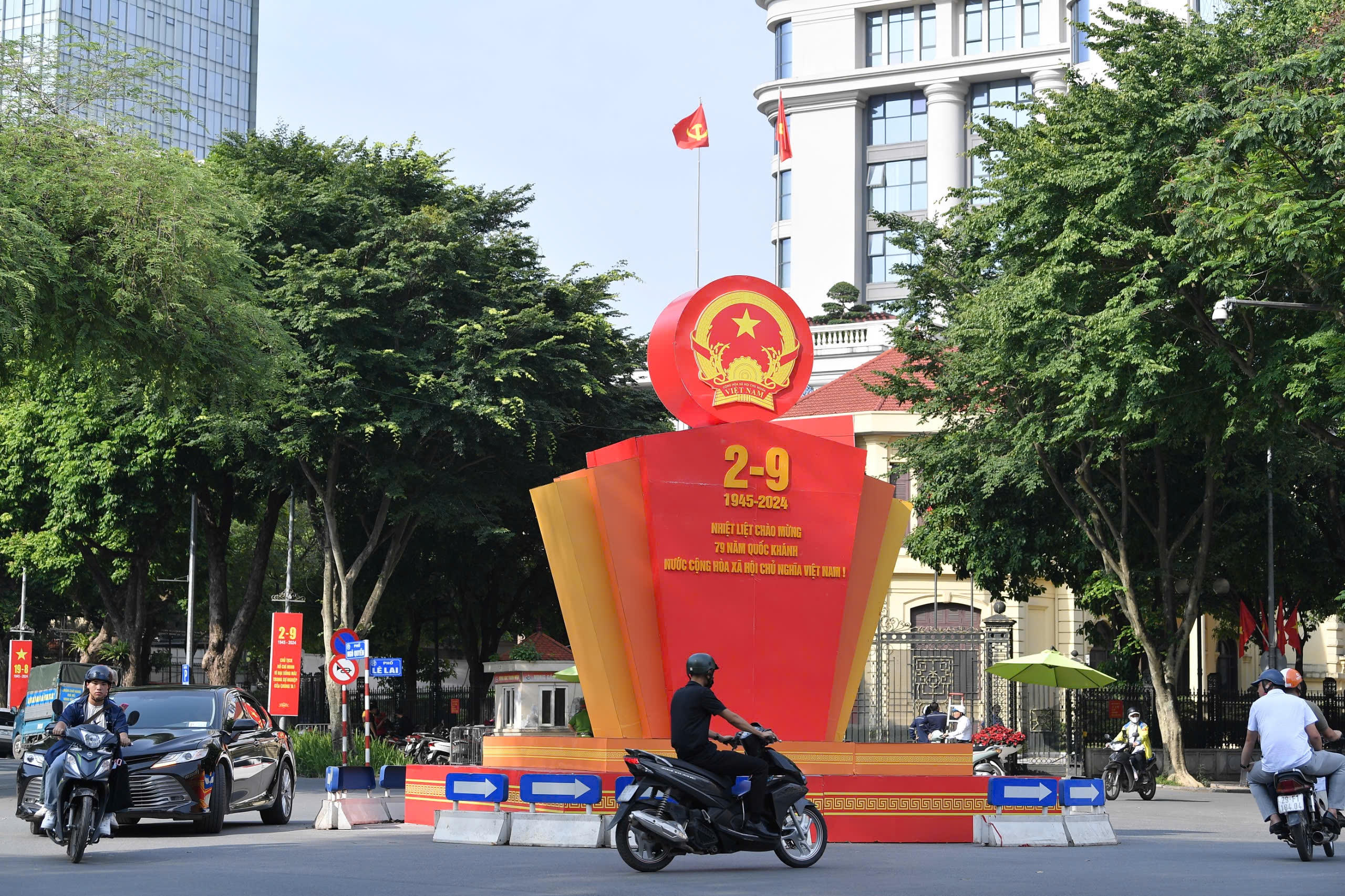 Sắc đỏ rực rỡ của màu cờ, băng rôn, khẩu hiệu, tranh cổ động, pano Chào mừng kỷ niệm 79 năm Cách mạng Tháng Tám và Quốc khánh 2/9 trên các tuyến phố ở Hà Nội.