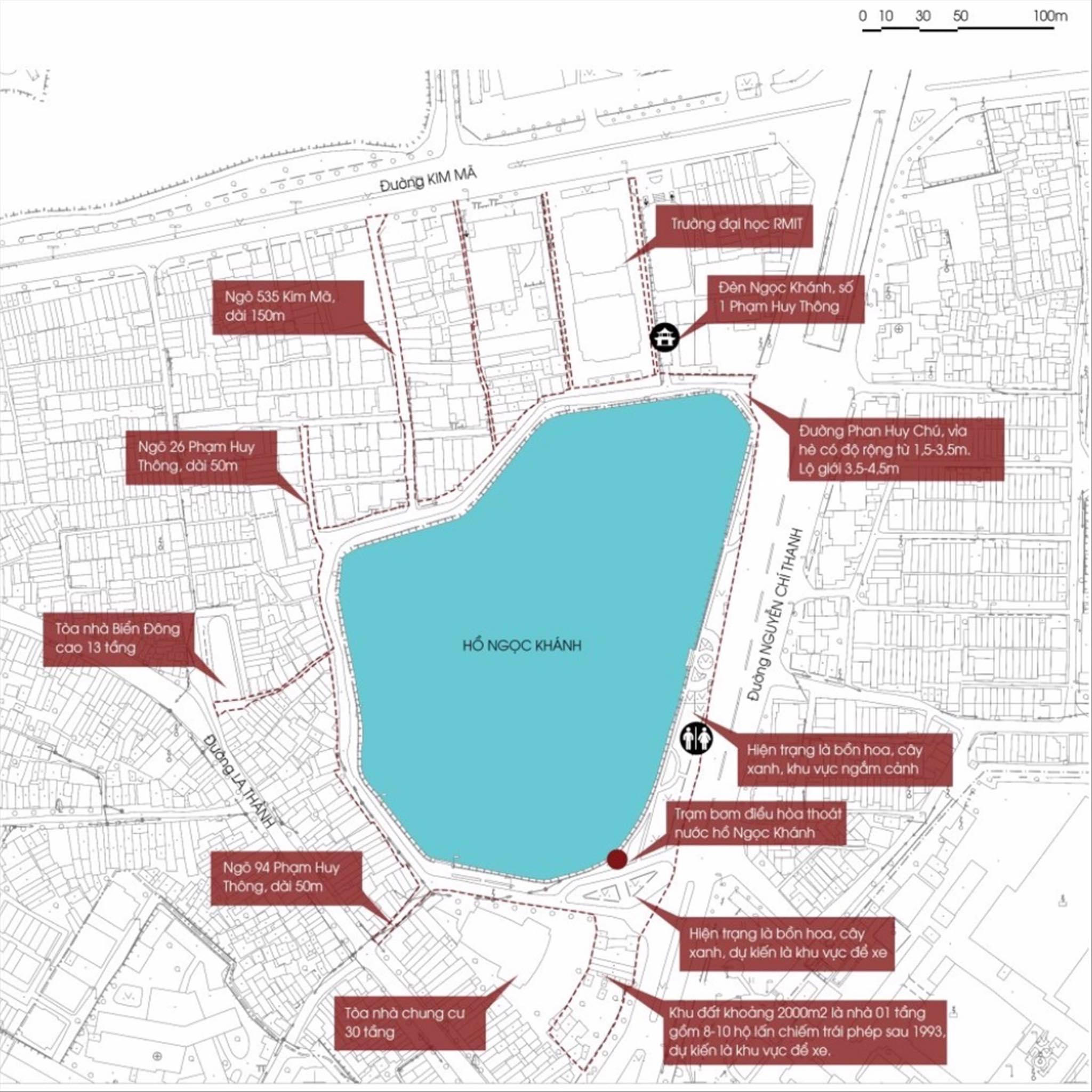 Khu vực nghiên cứu tổ chức phố đi bộ quanh hồ Ngọc Khánh. Đồ họa quận Ba Đình cung cấp