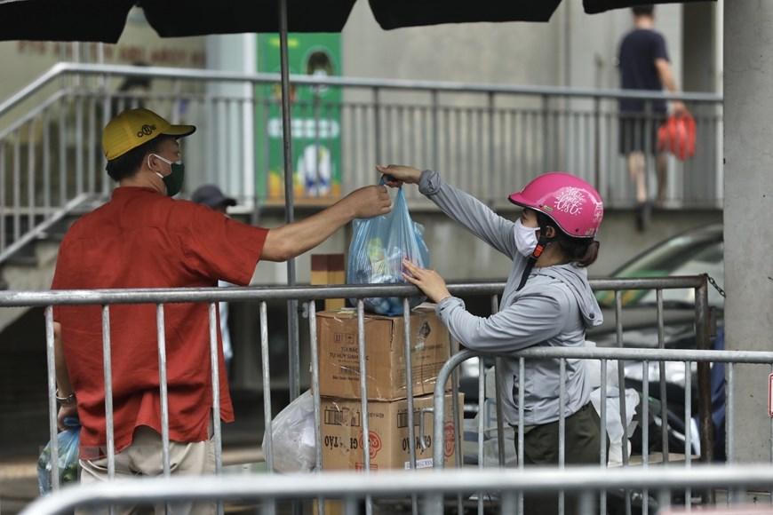 Người dân tiếp tế nhu yếu phẩm cho người thân trong khu vực bị cách ly phòng dịch tại Chung cư Ecohome 2 (Bắc Từ Liêm, Hà Nội) chiều 23/7/2021. Ảnh: TTXVN |