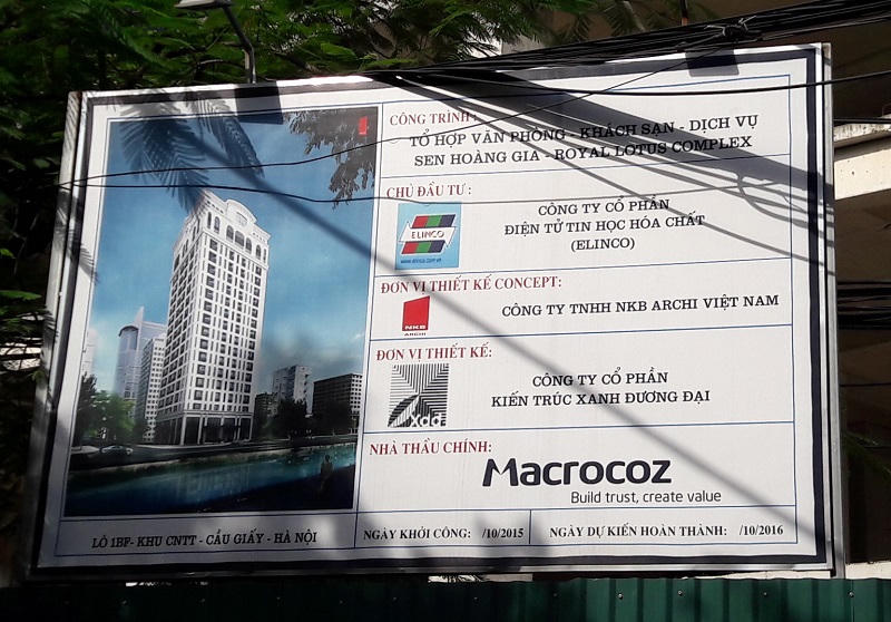Đó là công trình Tổ hợp văn phòng - Khách sạn - Dịch vụ Sen Hoàng Gia (Royal Lotus Complex) nằm trên phố Duy Tân, quận Cầu Giấy do Công ty Cổ phần Điện tử Tin học Hóa chất (ELINCO) thuộc Viện Khoa học Công nghệ quân sự - Bộ Quốc phòng làm chủ đầu tư.