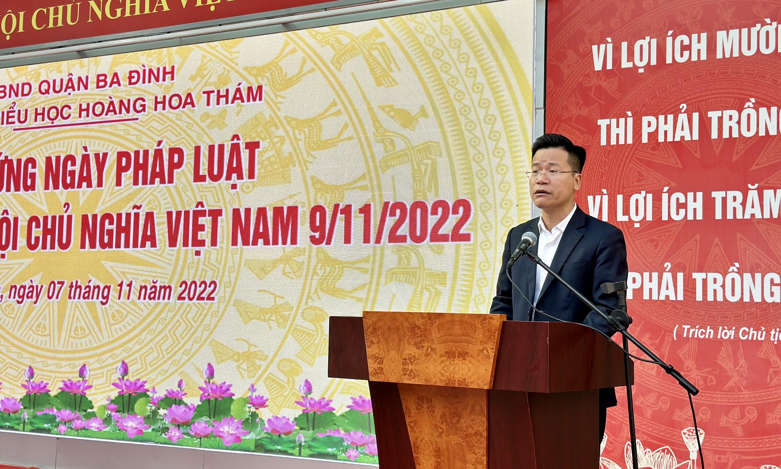 Ông Lê Đức Thuận, Trưởng Phòng Giáo dục và Đào tạo quận Ba Đình phát biểu tại buổi lễ hưởng ứng "Ngày Pháp luật nước CHXHCN Việt Nam" năm 2022 |