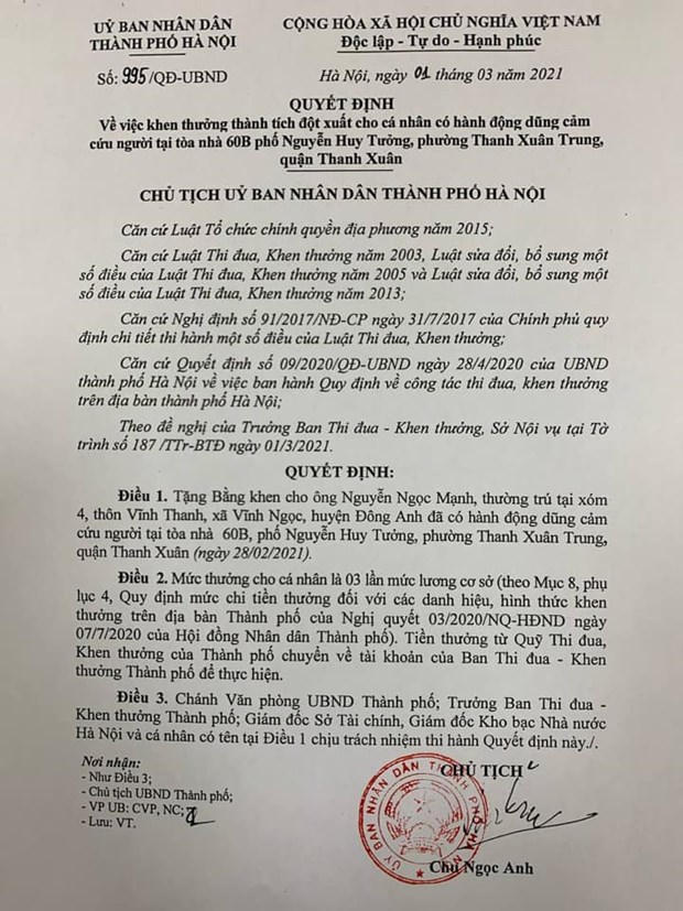 Theo đó, Chủ tịch UBND TP. Hà Nội Chu Ngọc Anh đã ký quyết định tặng Bằng khen cho anh Nguyễn Ngọc Mạnh (thường trú tại xóm 4, thôn Vĩnh Thanh, xã Vĩnh Ngọc, huyện Đông Anh, Hà Nội), đồng thời thưởng với mức thưởng cho cá nhân là 3 lần mức lương cơ sở (quy định tại Nghị quyết 03/2020/NQ-HĐND của NĐND TP. Hà Nội).