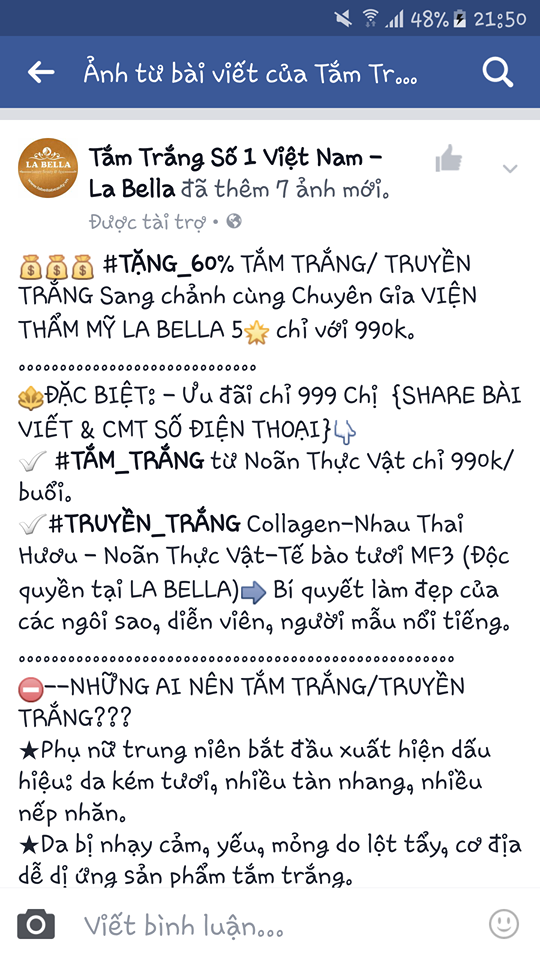 (PLO) - Tự nhận là thẩm mỹ viện có dịch vụ “tắm trắng số 1 Việt Nam”, La Bella Spa đang vi phạm khoản 11 Điều 8 Luật quảng cáo về hành vi cấm trong hoạt động quảng cáo ?