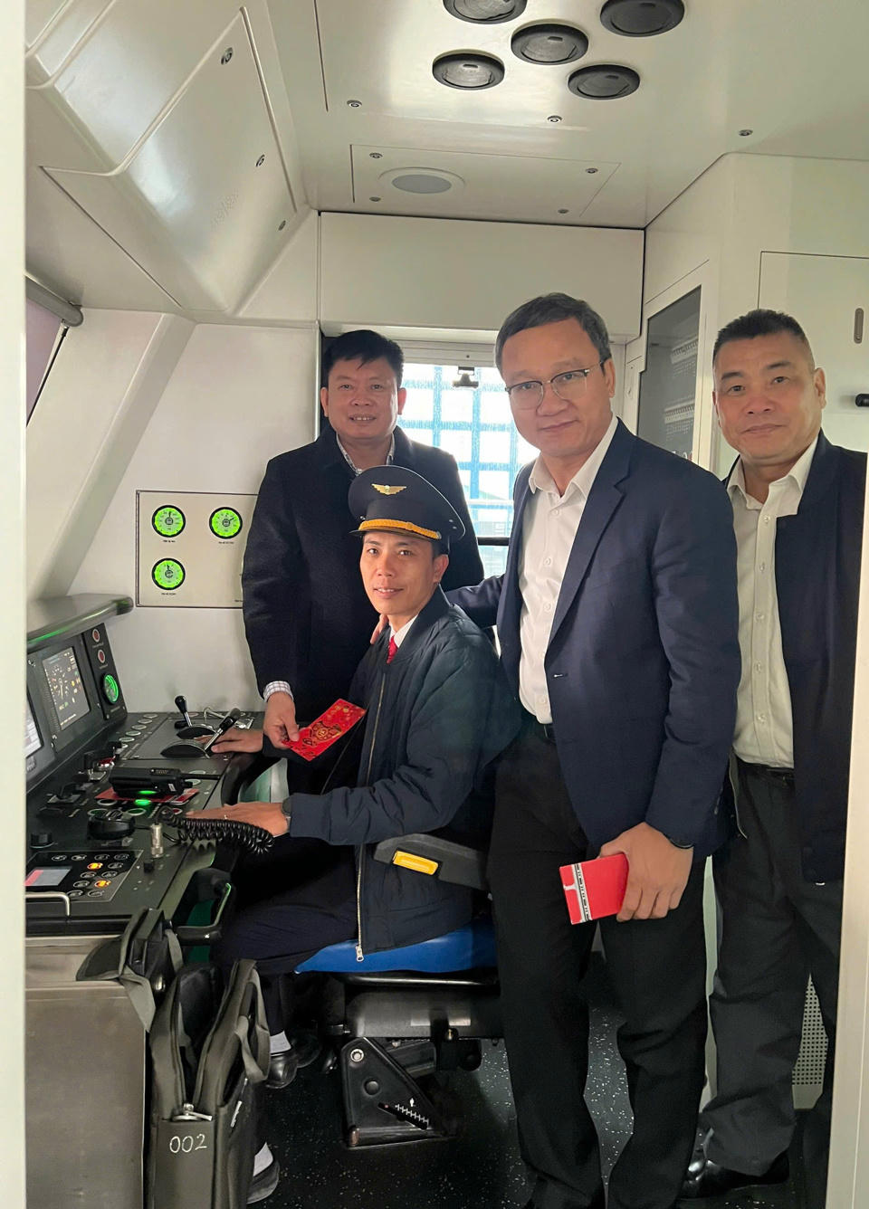 | Chủ tịch HĐTV Công ty TNHH MTV Đường sắt Hà Nội Khuất Việt Hùng (thứ hai bên phải) động viên lái tàu tuyến ĐSĐT số 3 |