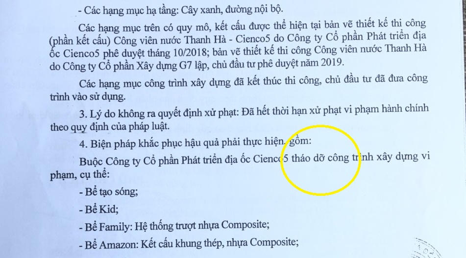 Trong kết luận thanh tra, TP TP Hà Nội nhận xét đầy đủ về lỗi của các bên, trong đó có lỗi của chủ đầu tư khi xây dựng công viên nước Thanh Hà mà không có giấy phép xây dựng; lỗi của công chức và chính quyền quận Hà Đông trong việc để xảy ra xây dựng không phép một công viên nước khá lớn trên địa bàn quận.
