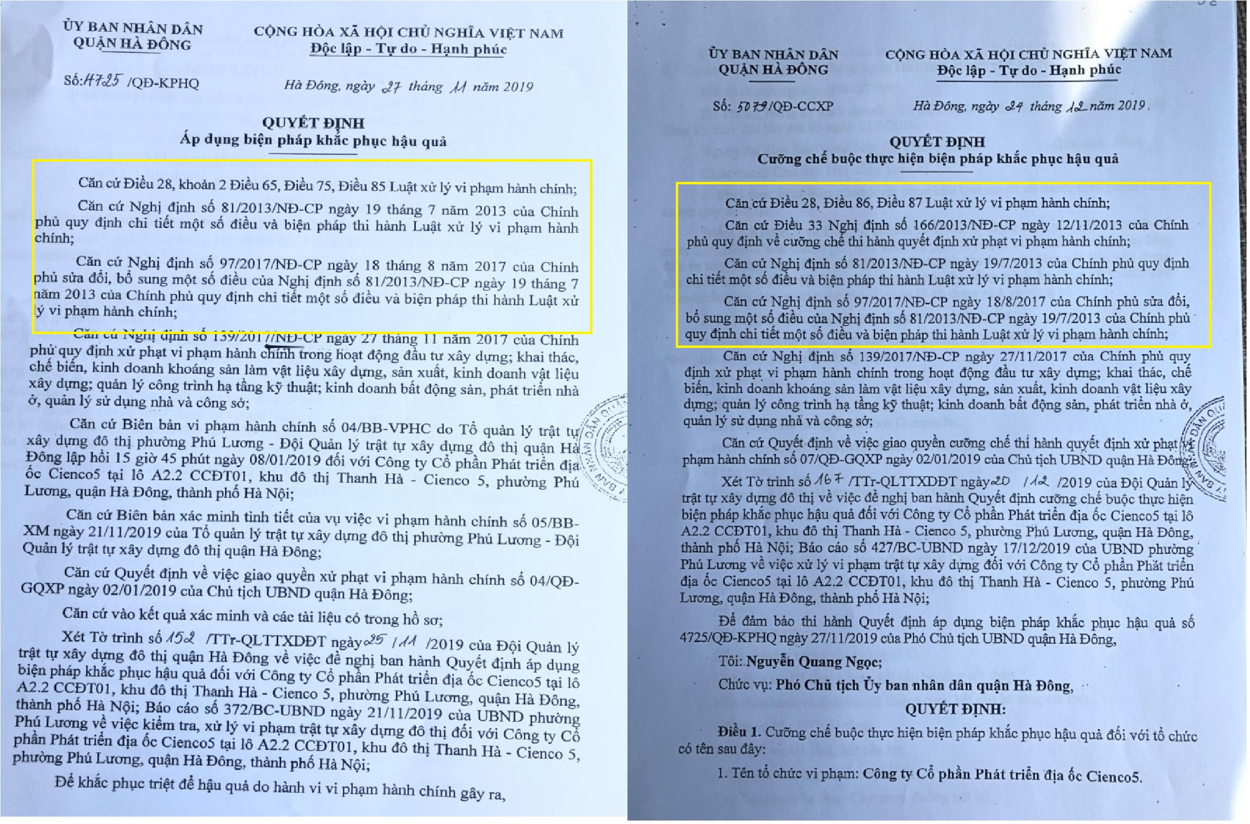 Cụ thể, trong quyết định số 5079 ngày 24/12/2019 của UBND quận Hà Đông về việc cưỡng chế thực hiện biện pháp khắc phục hậu quả, UBND quận Hà Đông đã căn cứ vào Luật Xử lý vi phạm hành chính và các nghị định của chính phủ về xử lý vi phạm hành chính. Quyết định nêu rõ việc cưỡng chế “tháo dỡ toàn bộ công trình xây dựng không phép”.