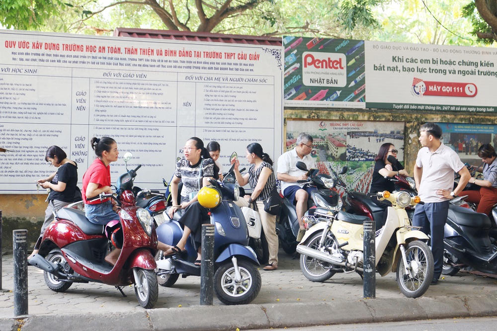 Ghi nhận tại điểm trường THPT Cầu Giấy, Hà Nội, ngay từ 6h sáng các phụ huynh đã đưa con tới điểm thi để tránh tắc đường khi di chuyển.
