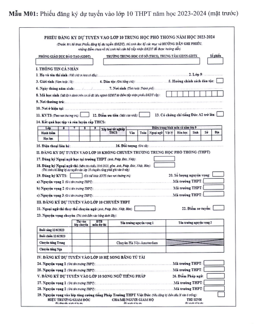 Phiếu đăng ký dự tuyển vào lớp 10 THPT năm học 2023-2024 mặt trước. |