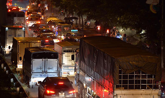 | Lượng phương tiện tăng mạnh tại khu vực các tuyến đường vành đai, đường trục chính của thành phố do nhiều người dân rời Hà Nội bằng xe máy, ô-tô con. |