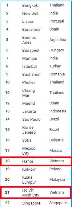 3 đại diện của Việt Nam đều là những thành phố nổi tiếng ở Việt Nam, không chỉ có nền kinh tế phát triển mà còn có nhiều điểm du lịch nổi tiếng, ẩm thực đa dạng, đặc sắc. So với nhiều thành phố khác trên thế giới thì tốc độ Wifi ở 3 thành phố của Việt Nam không phải là xuất sắc, nhưng chi phí cho việc ăn uống lại thấp hơn hẳn.
