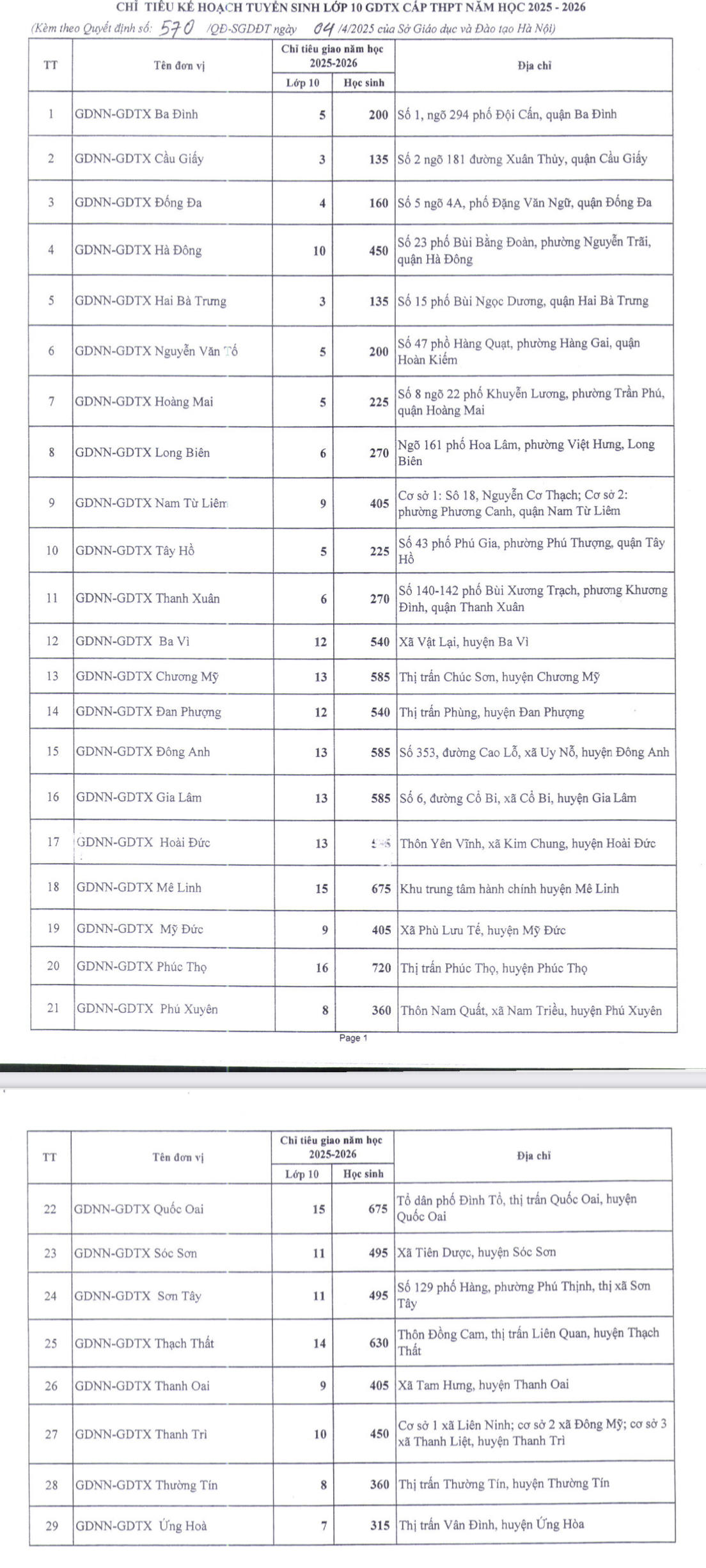 Trong đó, đơn vị được giao chỉ tiêu nhiều nhất là Trung tâm GDNN - GDTX Phúc Thọ với 720 chỉ tiêu cho 16 lớp 10. Tiếp theo là Trung tâm GDNN - GDTX Mê Linh, Trung tâm GDNN - GDTX Quốc Oai (mỗi Trung tâm 15 lớp với 675 học viên); Trung tâm GDNN - GDTX Thạch Thất (14 lớp với 630 học viên)... Đơn vị được giao chỉ tiêu ít nhất là Trung tâm GDNN - GDTX Cầu Giấy và Hai Bà Trưng với 135 học viên cho 3 lớp.