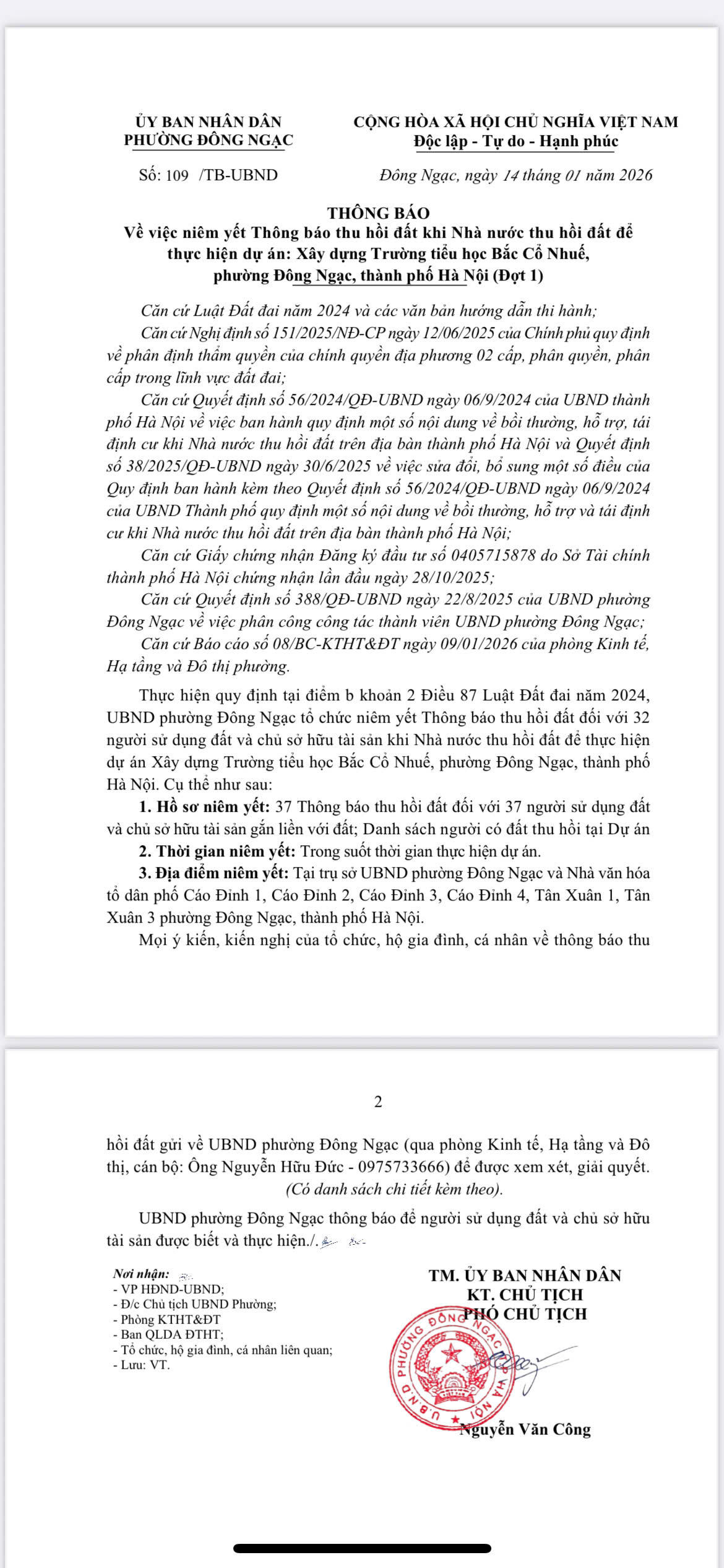 Thực hiện quy định tại điểm b khoản 2 Điều 87 Luật Đất đai năm 2024, UBND phường Đông Ngạc tổ chức niêm yết Thông báo thu hồi đất đối với 32 người sử dụng đất và chủ sở hữu tài sản khi Nhà nước thu hồi đất để thực hiện dự án Xây dựng Trường tiểu học Bắc Cổ Nhuế, phường Đông Ngạc, thành phố Hà Nội. Cụ thể như sau: