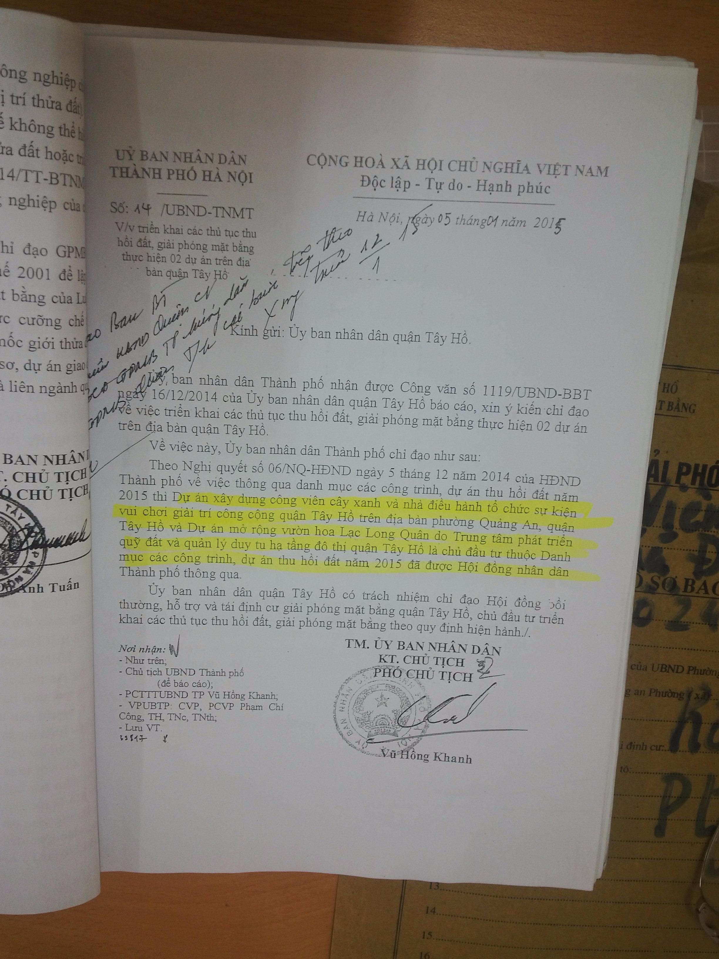Trong khi Chủ đầu tư số 1 đã thể hiện sức mạnh “ủng hộ và ứng trước” tài chính như đã nêu trên thì bỗng nhiên, ngày 5/1/2015, Phó chủ tịch UBND TP Hà Nội Vũ Hồng Khanh ký văn bản số 14, căn cứ vào Nghị quyết số 06 (ngày 5/12/2014) của Hội đồng nhân dân TP. Hà Nội mà chỉ đạo: ”Dự án xây dựng công viên cây xanh và nhà điều hành, tổ chức sự kiện vui chơi giải trí công cộng Tây Hồ (dự án đã có chủ đầu tư số 1 nêu trên)… do Trung tâm phát triển quỹ đất và quản lý duy tu hạ tầng đô thị quận Tây Hồ là chủ đầu tư”.